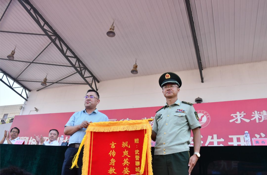 赵存吉向承训部队授予锦旗,对他们在军训期间所表现出的负责、坚韧和不屈不挠的精神予以表扬。