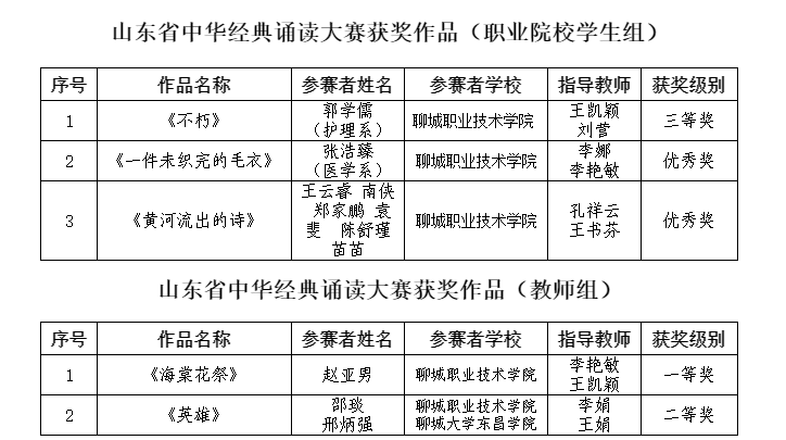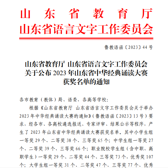 近日,山东省教育厅公布2023年山东省中华经典诵读大赛获奖名单,聊城职业技术学院报送的5项作品全部获奖,其中一等奖1项,二等奖1项,三等奖1项,优秀奖2项;两位教师荣获优秀指导教师。