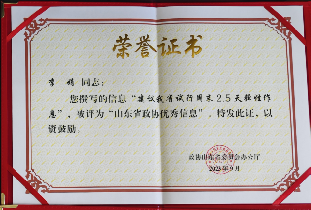 近日,山东省政协办公厅发布《关于开展山东省政协优秀信息、先进信息工作者评选表彰工作的通知》,对90件优秀信息、60名先进信息工作者予以表彰。民革山东省委委员、民革聊城市委会副主委、聊城市政协委员、聊城职业技术学院语委办主任李娟撰写的《建议我省试行周末2.5天弹性作息》被评为“山东省政协优秀信息”,受到山东省政协通报表彰。