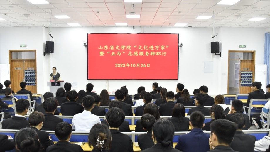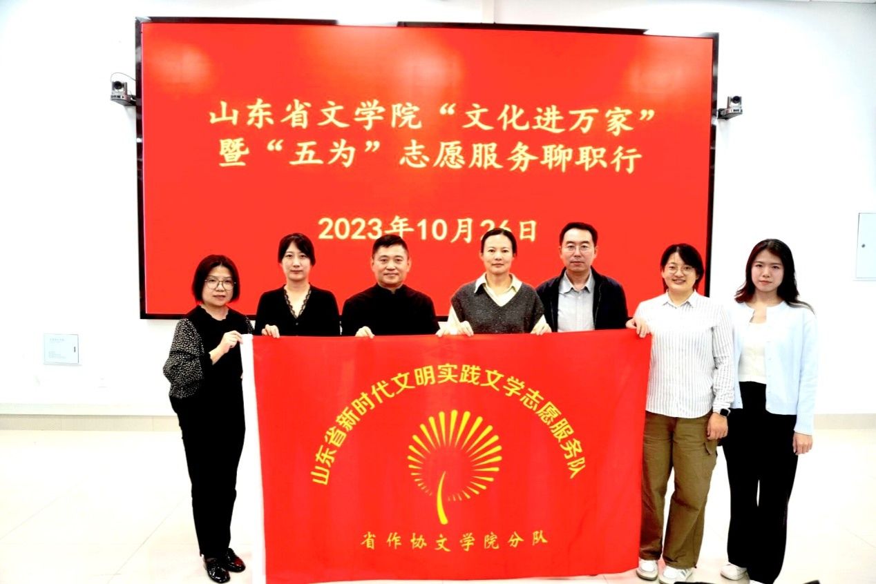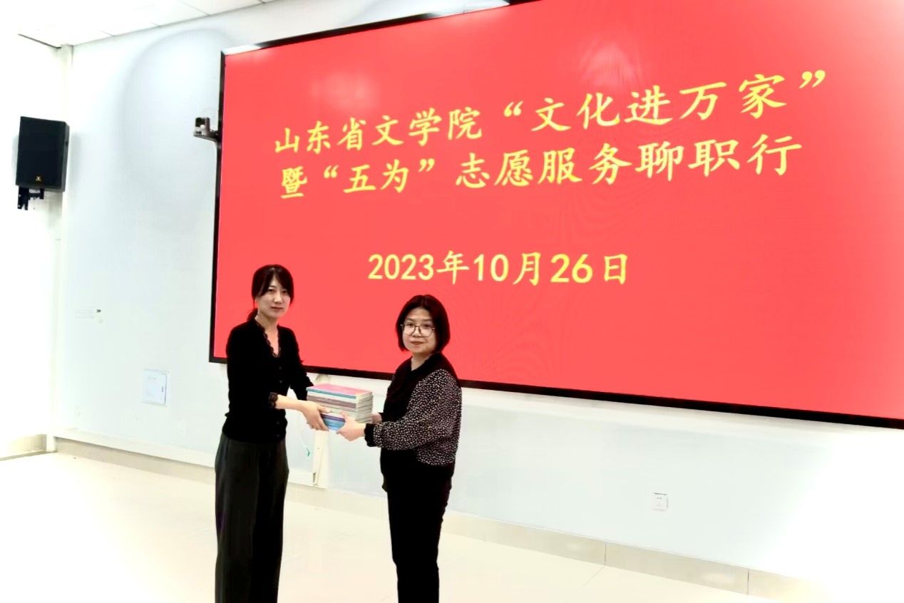 为深入学习贯彻习近平文化思想,进一步做好宣传思想文化工作,推进新时代文明实践文学志愿走深走实,10月26日,山东省文学院在我校举行“文化进万家”暨“五为”志愿服务活动,聊城市作协副主席、作家范玮,东营市文联文艺创作研究院院长、作家杨袭,山东省文学院文创二级作家仲文娜,山东省文学院高天瑶、邵宇欣莅临指导。基础部主任孔祥云主持活动,我校师生代表参加。