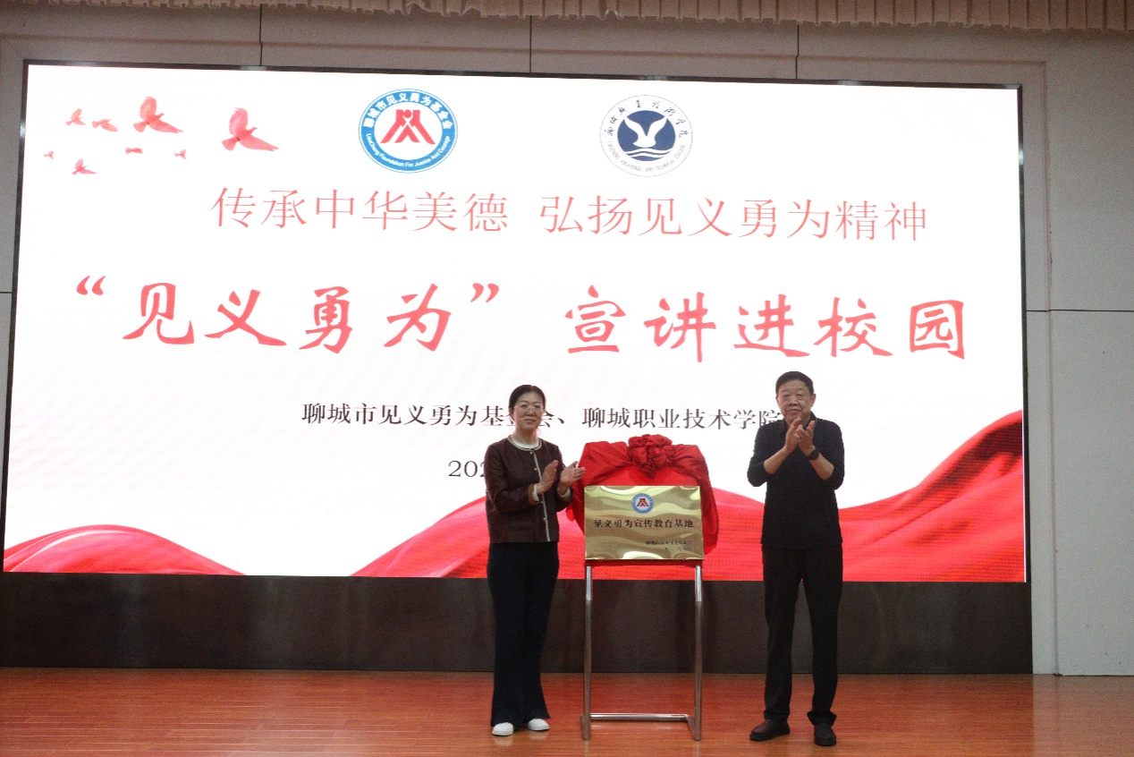 付强理事长为聊城职业技术学院颁发“见义勇为宣传教育基地”牌匾并赠予相关书籍40余册。