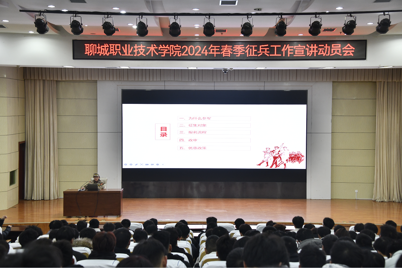 为深入贯彻落实习近平强军思想,进一步落实国家相关征兵工作要求,帮助大学生全面了解征兵政策,激发应征入伍热情,11月10日,聊城职业技术学院联合东昌府区人武部来校开展“2024年春季征兵工作宣讲动员会”。