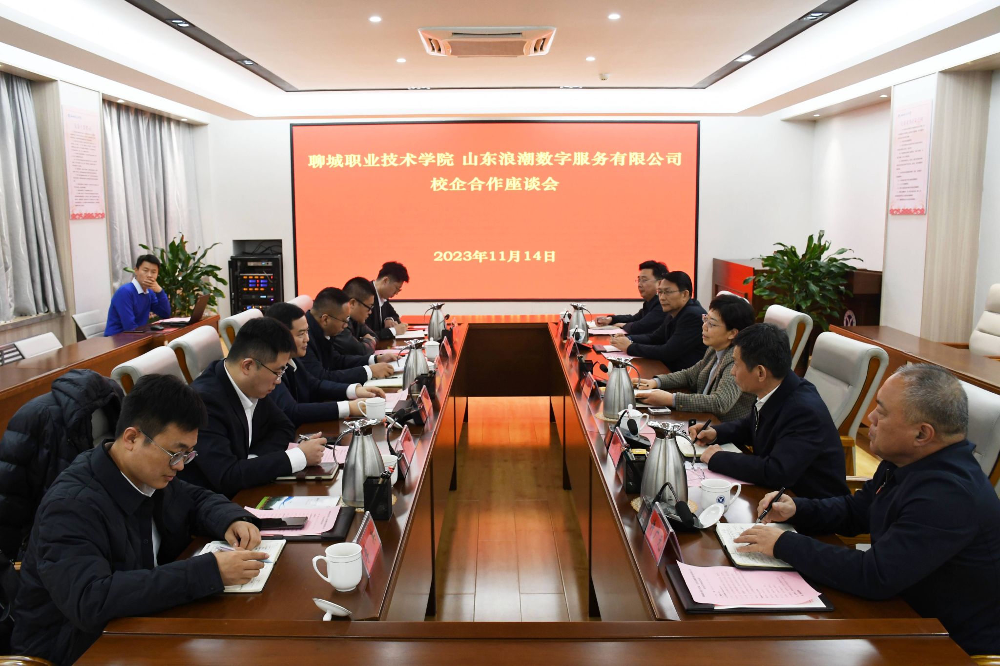 11月14日,山东浪潮数字服务有限公司党总支书记、董事长王晓文,党总支委员、总经理陈洪涛一行来聊城职业技术学院访问交流。学校党委书记靳凤莲,党委副书记、院长徐龙海,党委委员、副院长李继峰,党委委员、副院长许广元热情接待来宾。