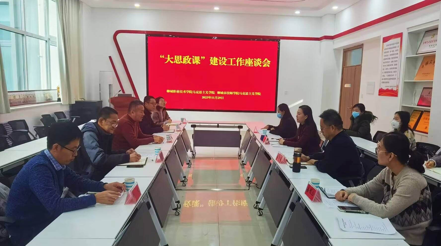 11月29日,聊城市技师学院马克思主义学院院长王海民,副院长岳远涛、李学军等一行到聊城职业技术学院马克思主义学院交流座谈。座谈会由我校马克思主义学院党总支书记、院长孙剑主持。