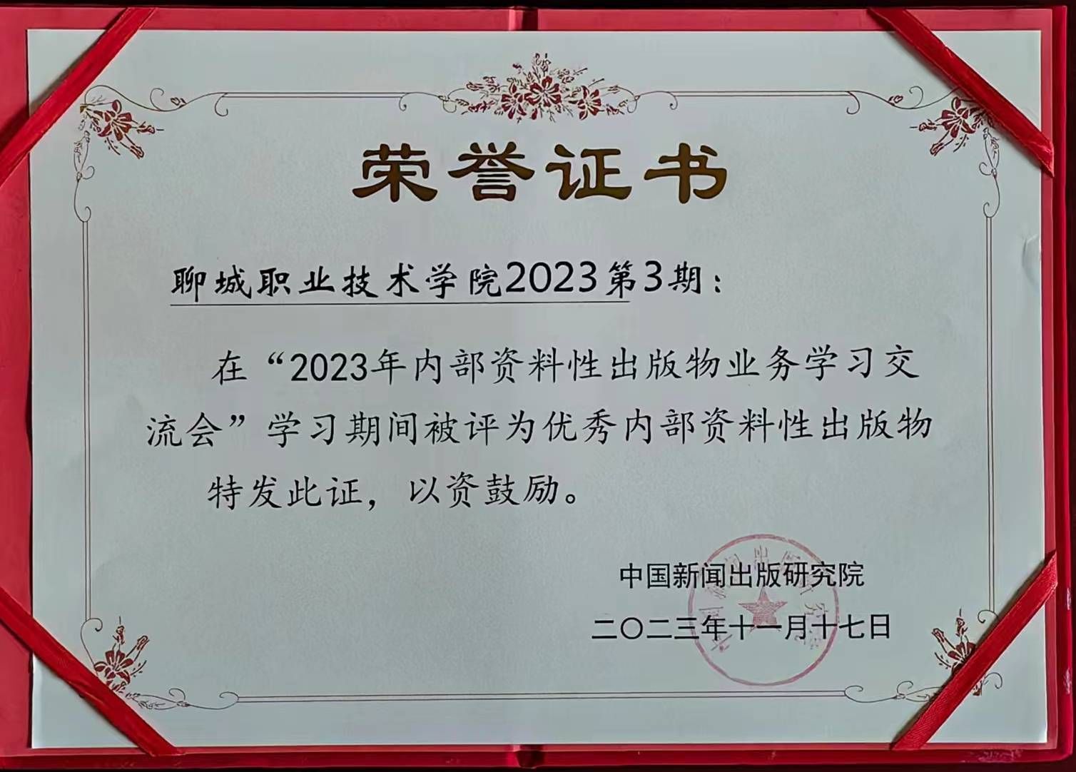 近日,2023年内部资料性出版物业务学习交流会在北京举行,会议由隶属于中共中央宣传部的中国新闻出版研究院主办。会上,我校的内部资料性出版物《聊城职业技术学院》在众多参选作品中脱颖而出,荣获“优秀内部资料性出版物”称号。