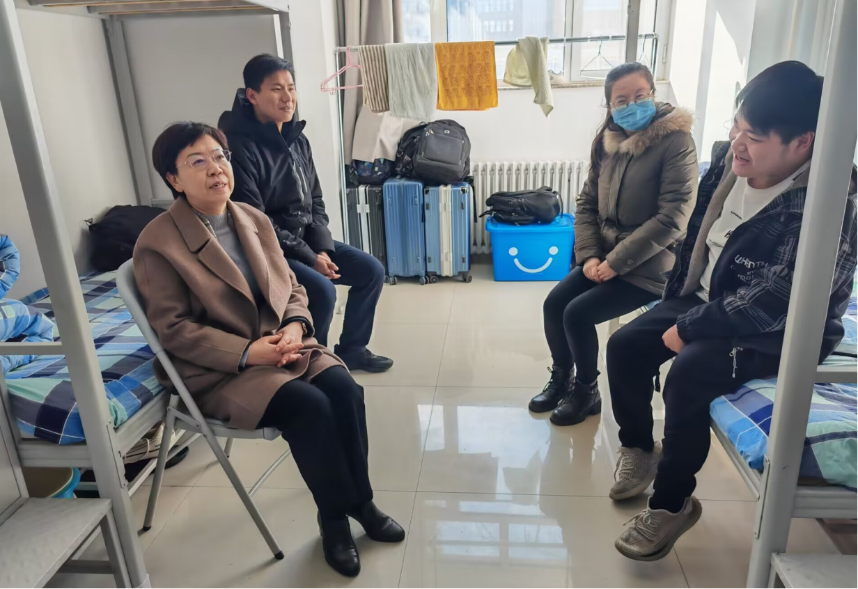在学生宿舍,靳凤莲询问了受访学生的家庭情况、学习情况、经济状况等方面情况。了解基本状况后,靳凤莲赞扬了他们自强不息、努力学习的可贵精神,并赠予助学用品,送上温馨祝福,勉励受访学生一定要好好学习,对生活保持信心,引导大家有事一定要及时求助老师。随后,受访学生就生活与学习上的困难提出问题,靳凤莲认真聆听并提供解决建议。在听了老师们的建议后,受访学生表示要努力学习,心怀感恩,绝不辜负这份关爱。