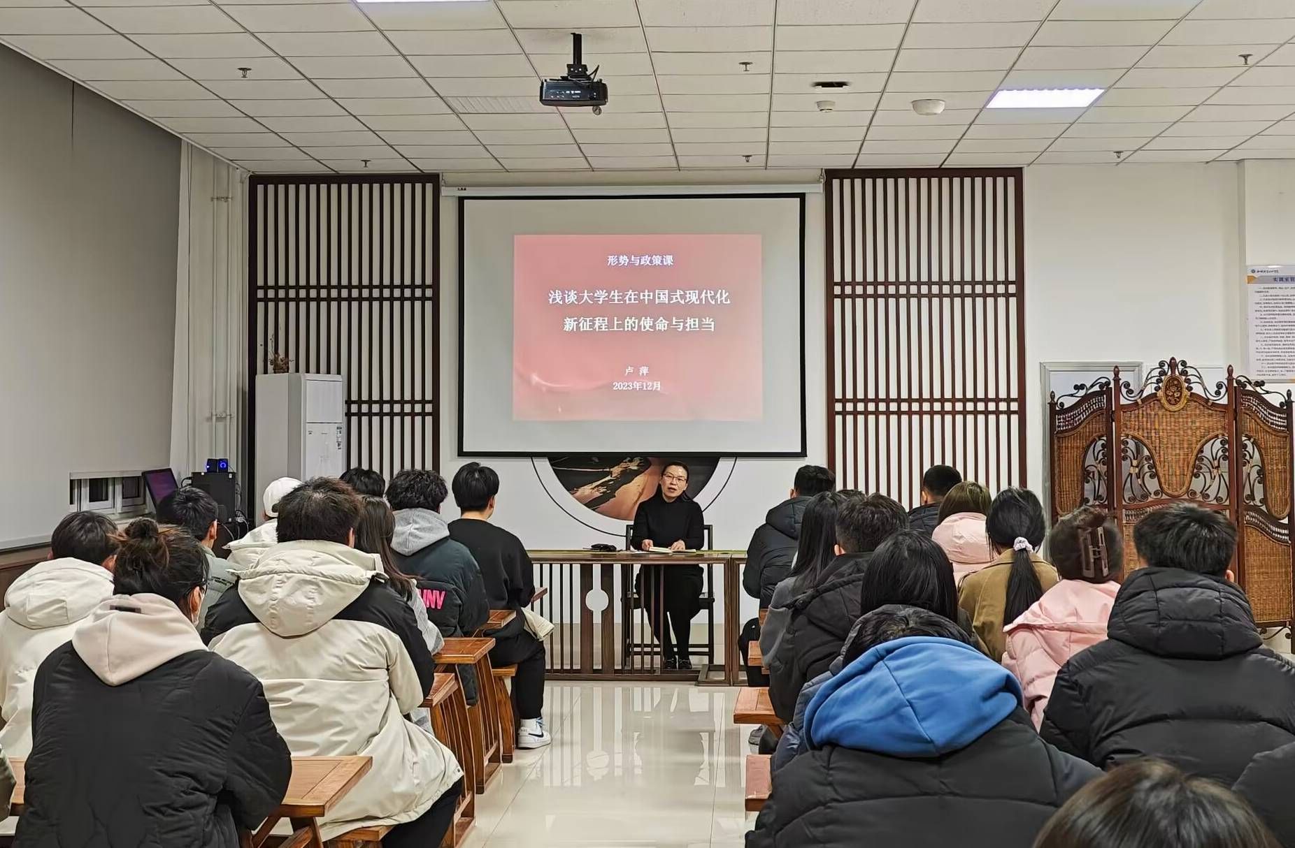 12月5日,学校党委委员、宣传部部长卢萍以《浅谈大学生在中国式现代化新征程上的使命与担当》为题,为旅游管理系入党积极分子和学生干部代表讲授形式与政策课.