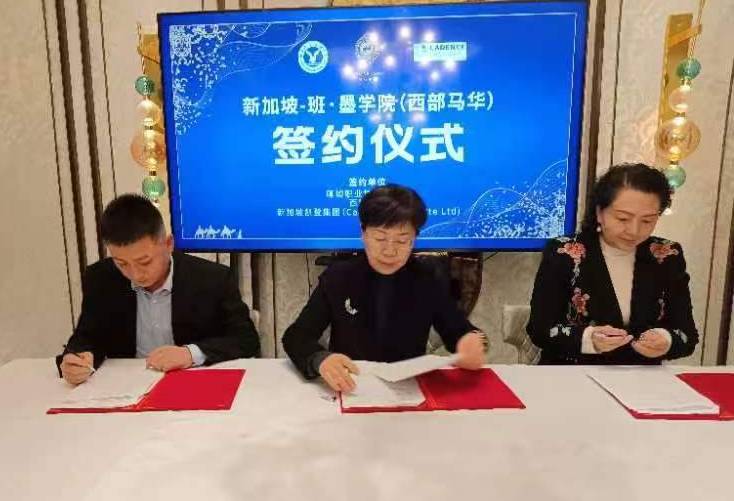 会议期间,靳凤莲开展访企拓岗,走访了西部马华企业管理集团有限公司,并与西部马华及新加坡凯登集团开展深入交流,围绕酒店、烹饪、物流、财会、医养等专业人才需求,三方签署了合作建设“班·墨学院”的协议;共同致力于多工种、多语言的教学资源库,“职业技能+中文”,多功能产学研实训基地,联合开发国际认可的国际职业标准、专业标准、课程标准等符合“班·墨学院”建设计划的十大建设任务。