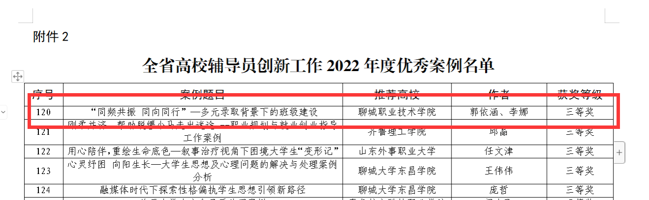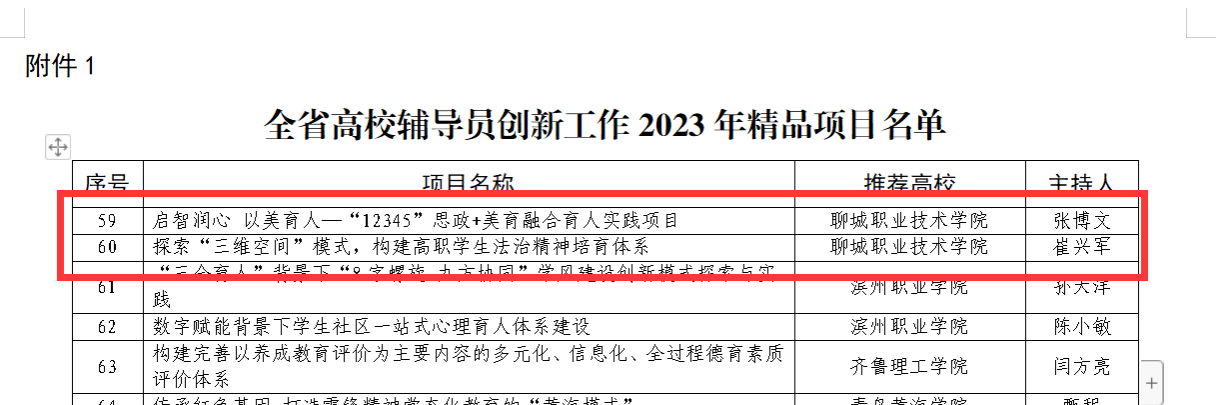 近日,山东省教育厅(省委教育工委)公布了全省高校辅导员创新工作评选结果,聊城职业技术学院崔兴军老师主持的《探索“三维空间”模式,构建高职学生法治精神培育体系》和张博文老师主持的《启智润心 以美育人——“12345”思政+美育融合育人实践项目》获评全省高校辅导员创新工作2023年精品项目,实现了在该领域的新突破;李娜、郭依涵老师申报的案例《“同频共振 同向同行”——多元录取背景下的班级建设》获评2022年度辅导员优秀工作案例三等奖。
