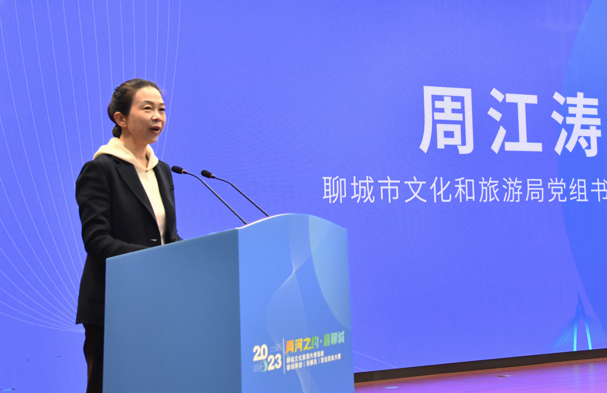 周江涛在致辞中介绍,近年来,聊城围绕“两河之约”文旅品牌,持续深化“我家门前有条河”推广品牌,先后承办“沿着黄河遇见海”2023好客山东文旅新媒体创作者大会,举办文旅形象推广大使选拔、旅行线路产品创新推广、原创主题音乐推广、两河文化融合发展论坛等系列活动。随着济郑高铁的开通,聊城迎来旅游“加速度”,在文旅转型发展、深度融合的关键时期,举办2023聊城文化旅游大使选拔暨导游(讲解员)职业技能大赛是聊城文旅树品牌、提质量、展形象、促发展的重要实践。她希望文旅大使和导游(讲解员)多渠道、广角度、全方位展现聊城的自然风光、文化风韵、民俗风情和生活风尚,让更多的人了解聊城、喜欢聊城,进而来到聊城、爱上聊城。