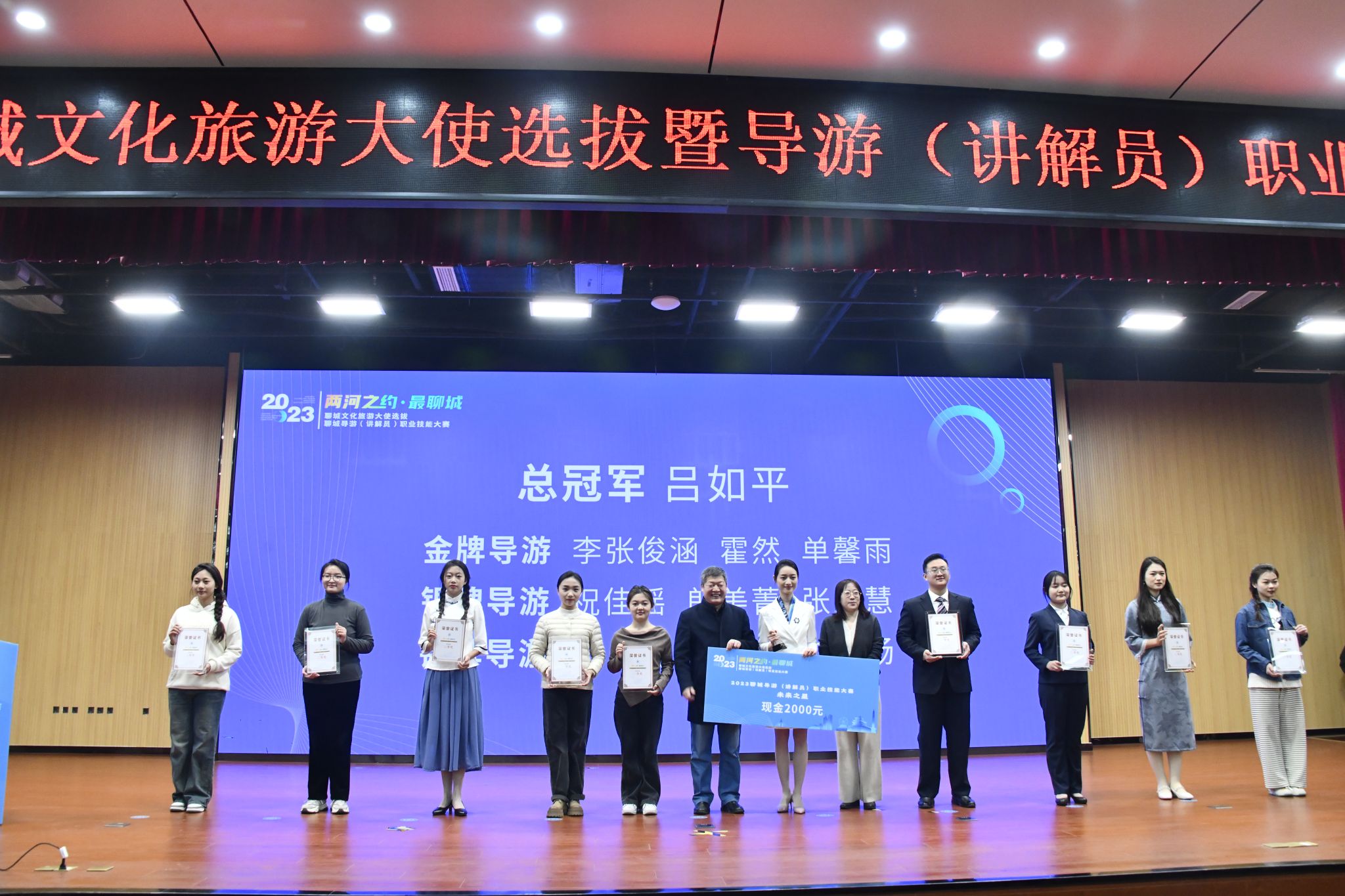 山东旅游职业学院、聊城职业技术学院、山东青年政治学院、聊城高级财经职业学校的师生代表,聊城市精品旅游促进会、聊城市旅行社协会、聊城市导游协会相关负责同志,文旅企业代表,大赛获奖选手约300余人参加颁奖典礼。