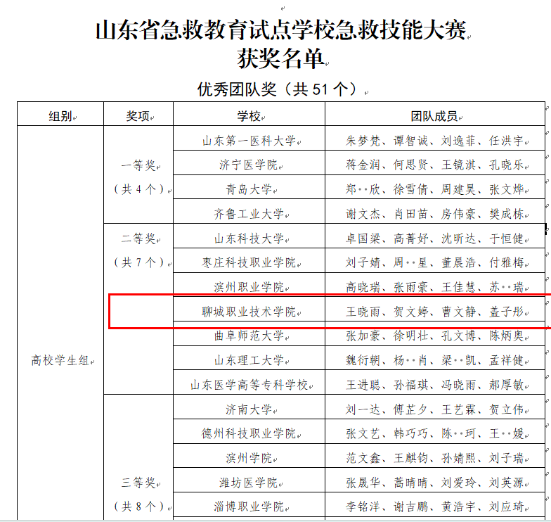 近日,由山东省教育厅和山东省红十字总会主办、山东第一医科大学承办的首届山东省急救教育试点学校急救技能展示活动在济南落下帷幕。来自全省72所(高校27所,中小学45所)全国急救教育试点学校参加本次交流展示。经过激烈角逐,我校代表队凭借扎实的理论功底、出色的急救技能、优秀的团队能力,最终,荣获实践操作第二名,总成绩二等奖(第8名)。