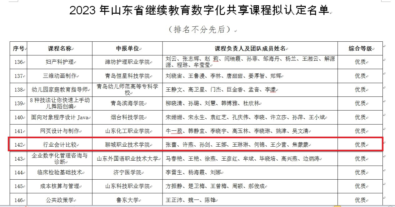 12月30日,山东省教育厅公布了2023年山东省继续教育数字化共享课程遴选结果,聊城职业技术学院经济管理系张蕾主持申报《行业会计比较》课程入选山东省继续教育数字化共享课程,并被评为优质课程。