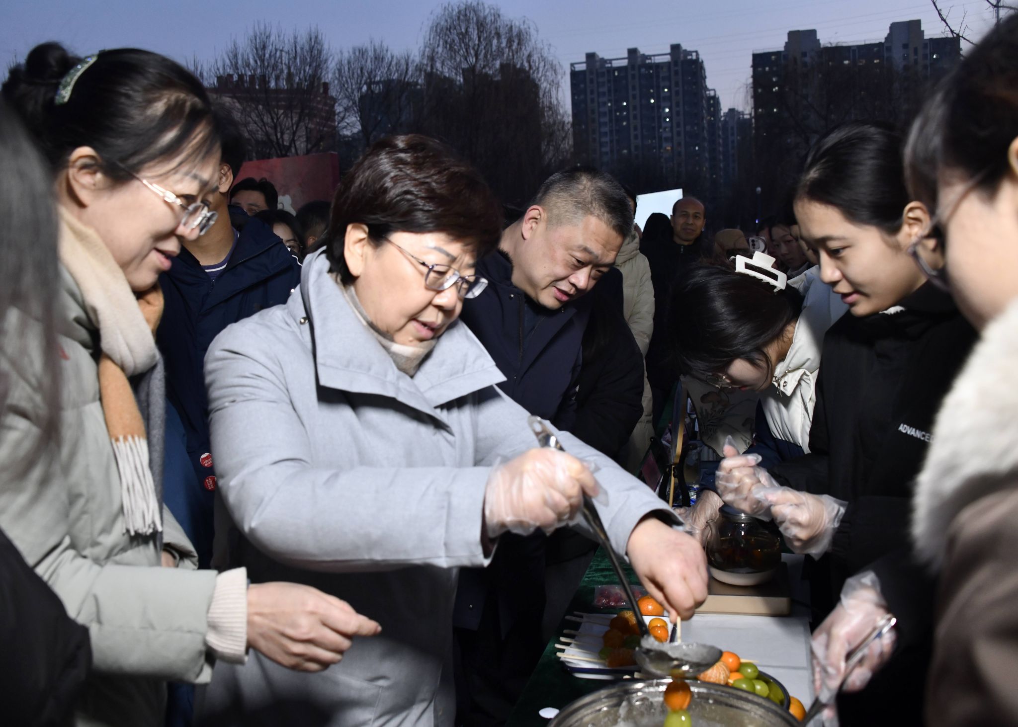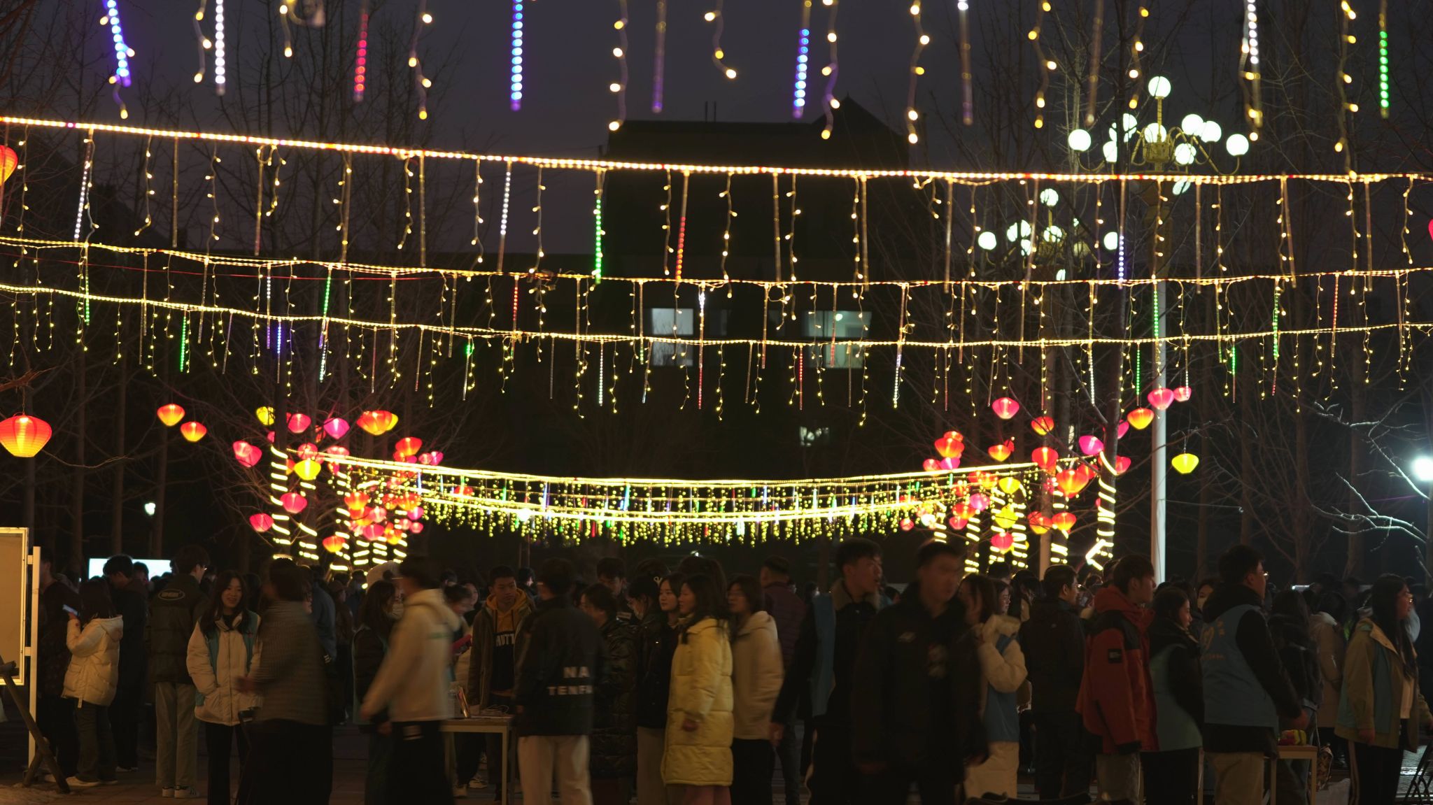 华灯初上,图书馆广场前装扮一新。歌舞表演和传统汉服展示精彩纷呈,现场人头攒动,热闹非凡。