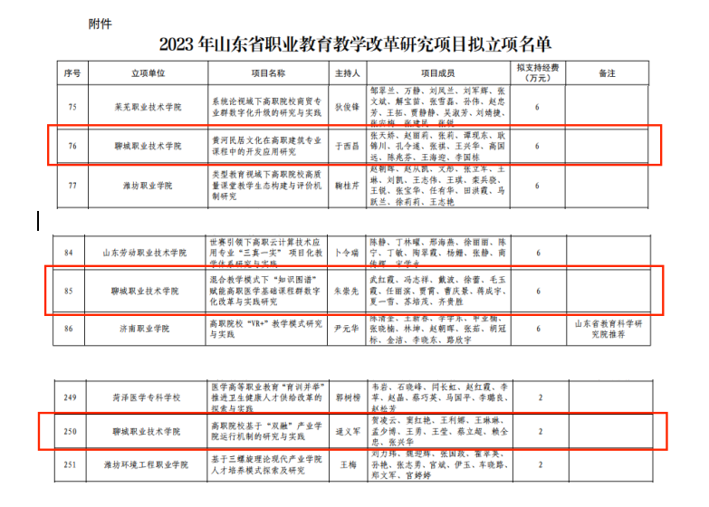 近日,山东省教育厅公示了2023年山东省职业教育教学改革研究项目,聊城职业技术学院立项3项省教改项目,支持经费14万元。其中,于西昌教授主持的《黄河民居文化在高职建筑专业课程中的开发应用研究》、朱崇先教授主持的《混合教学模式下“知识图谱”赋能高职医学基础课程群数字化改革与实践研究》立项为重点项目,每项给予6万元支持经费。