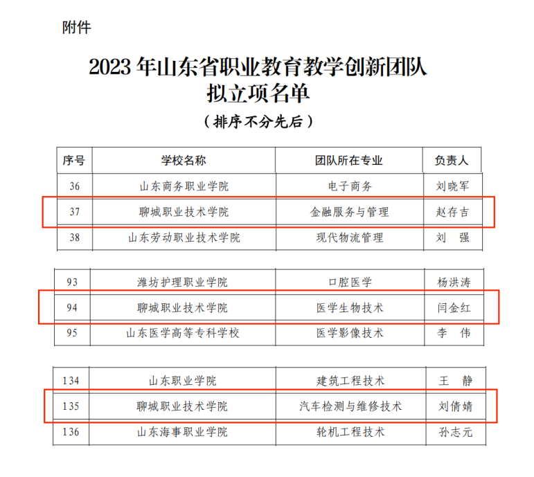 近日,山东省教育厅公示了2023年山东省职业教育教学创新团队遴选结果,聊城职业技术学院推荐的“医学生物技术专业教学创新团队”“金融服务与管理专业教学创新团队”“汽车检测与维修技术专业教学创新团队”, 全部通过省职业教育教学创新团队认定。截至目前,学校拥有国家级职业教育教学创新团队1个,省级教学创新团队6个,形成了“国家级-省级-校级”团队建设梯队,团队建设强力引领学校高水平师资队伍建设。
