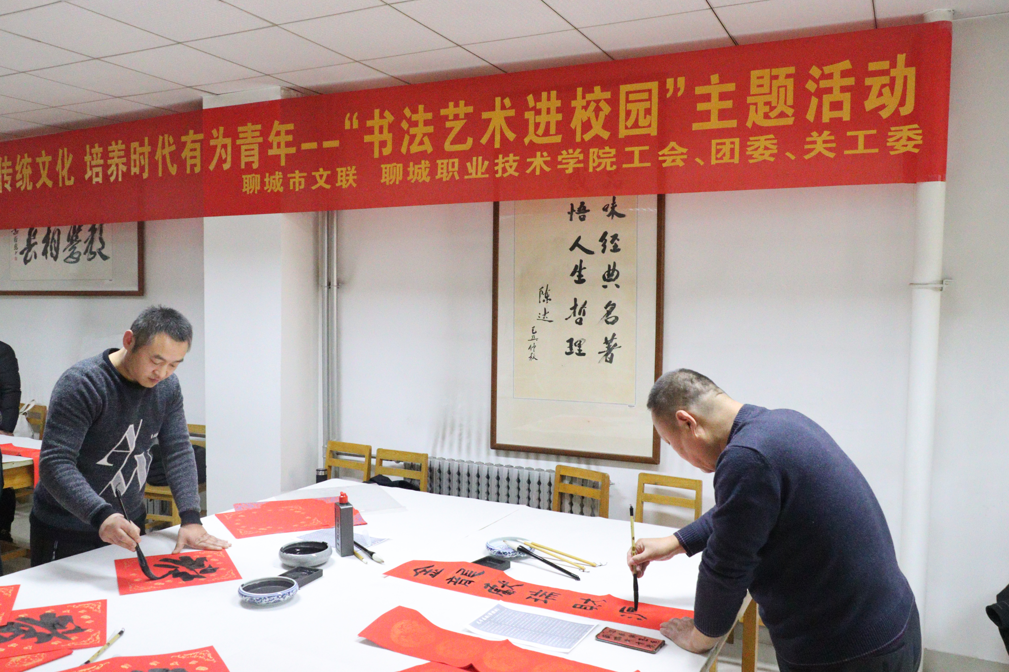 活动现场,气氛浓郁,翰墨飘香。来自聊城市文联、聊城市书法家协会的艺术家们和我校师生书法爱好者一起现场挥毫,展现中华优秀传统文化的魅力。一幅幅喜气盈盈的春联、一幅幅墨宝超然沁心、古朴雅致、隽永俊秀,写出了对新时代的赞美,对传统文化的礼赞。