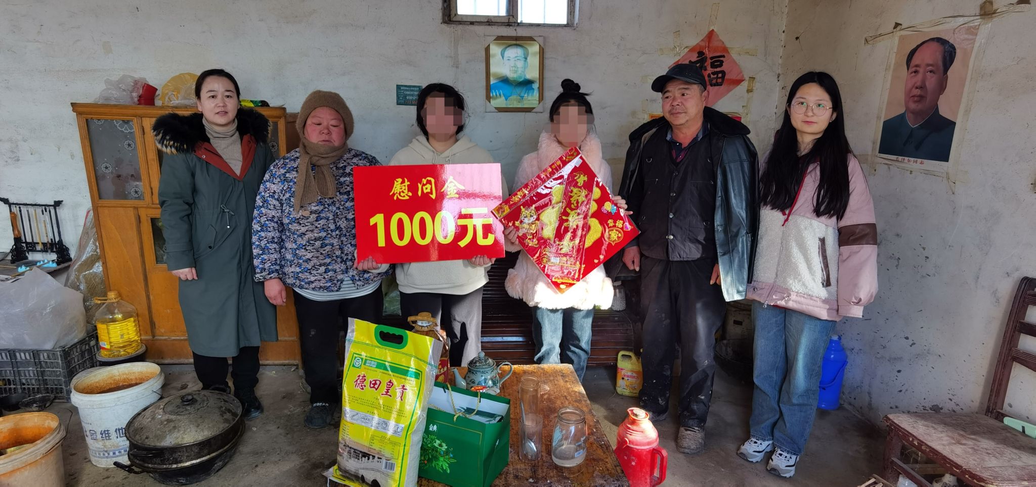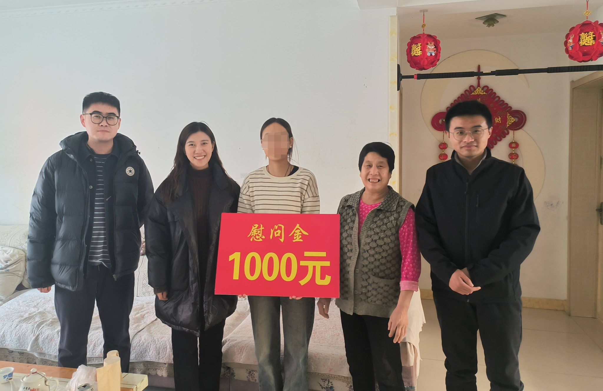 “大娘,您放心,我们会努力教好每一个学生,以后我们会更加关注彩丽,鼓励她多参加一些活动,要敢于有梦,勇于追梦,坚强乐观起来,家里的事不要有压力,有国家和学校的帮助,一定会渡过难关。”临别之际,冯同学拿出老师们送来的对联和福字,说今年要好好的开开心心的过一个年。