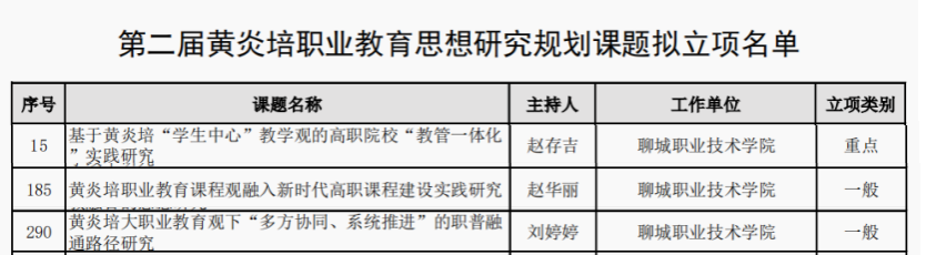 近日,中华职业教育社公布第二届黄炎培职业教育思想研究规划课题立项名单,聊城职业技术学院共有3项课题获批立项。其中,赵存吉主持的《基于黄炎培“学生中心”教学观的高职院校“教管一体化”实践研究》获批重点课题,赵华丽主持的《黄炎培职业教育课程观融入新时代高职课程建设实践研究》、刘婷婷主持的《黄炎培大职业教育观下“多方协同、系统推进”的职普融通路径研究》获批一般课题。