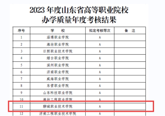 近日,山东省教育厅公示2023年度山东省高等职业院校办学质量年度考核结果,聊城职业技术学院位列全省第11名,连续三年稳居A档。