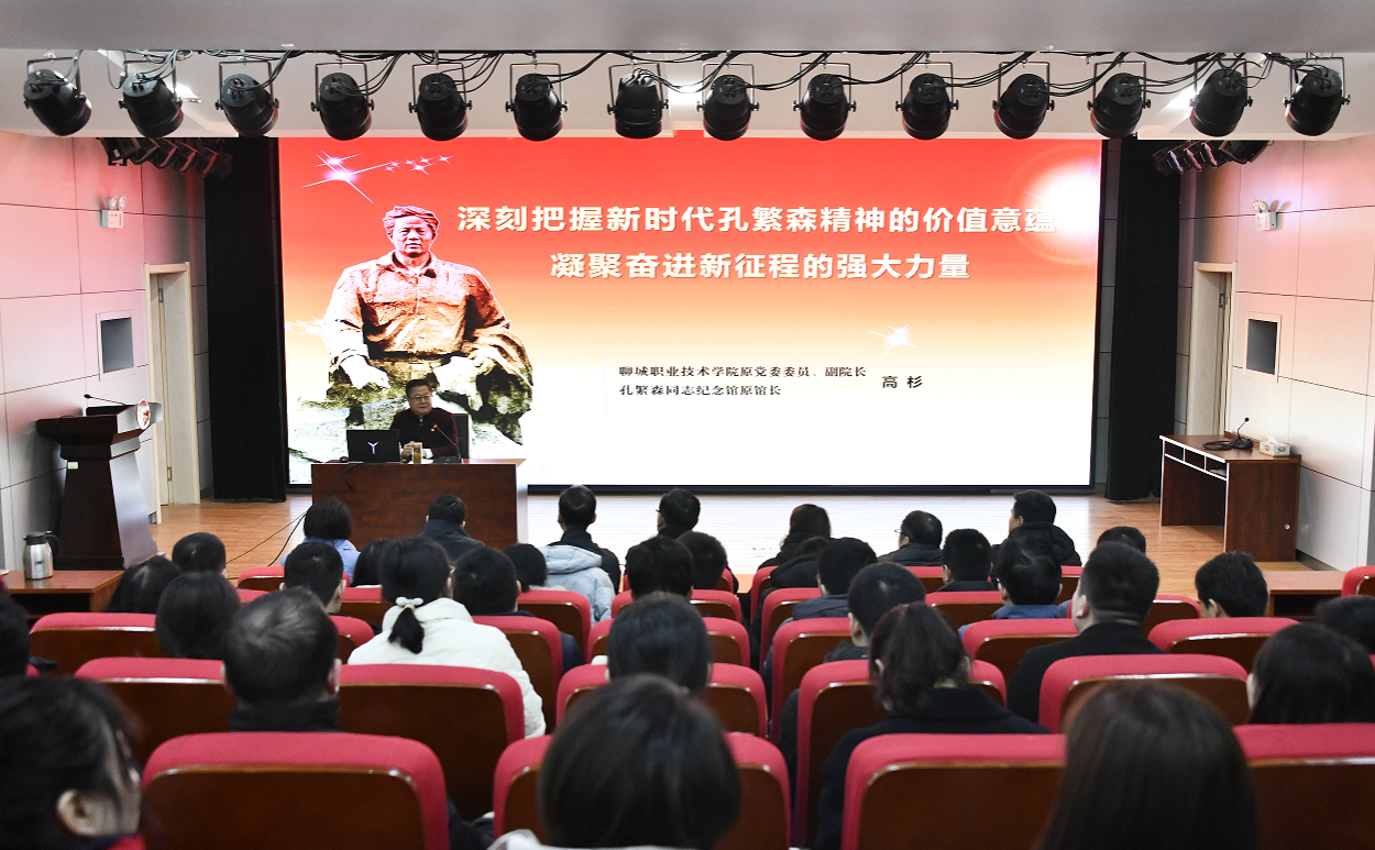参观结束后,聊城职业技术学院原党委委员、副院长,孔繁森同志纪念馆原馆长高杉以“深刻把握新时代孔繁森精神的价值意蕴 凝聚奋进新征程的强大力量”为题为全体新任职干部讲授专题党课。在党课正式开始之前,高杉带领所有新任职干部一起观看了《口述孔繁森》系列访谈节目,让所有新任职干部更加切实感受到孔繁森同志一心为民、爱民的思想境界。党课上,高杉从“赤诚”“担当”“大爱”“无我”四个方面,深刻阐释了孔繁森精神丰富内涵,并对新任职干部提出要求:一要正确对待自己。“我还是原来的我”,使命未变,责任未变,要有更高的要求和更严的标准来对待自己,把责任清单完整好。二要处理好关系。要处理好面子和里子的问题,着眼于发展,处理好个人和集体的关系,学会换位思考,学会配合,言行一致。三是学习孔繁森同志的境界。要培养爱人民、爱教育、爱学生的高尚情怀,真正实现与人民同呼吸、共命运、心连心。四是弘扬教育家精神。要优秀做人、成功做事、幸福生活,传前辈之精神,做同行之表率,书后来之榜样,为聊职增光添彩,为“双高”院校建设再立新功。