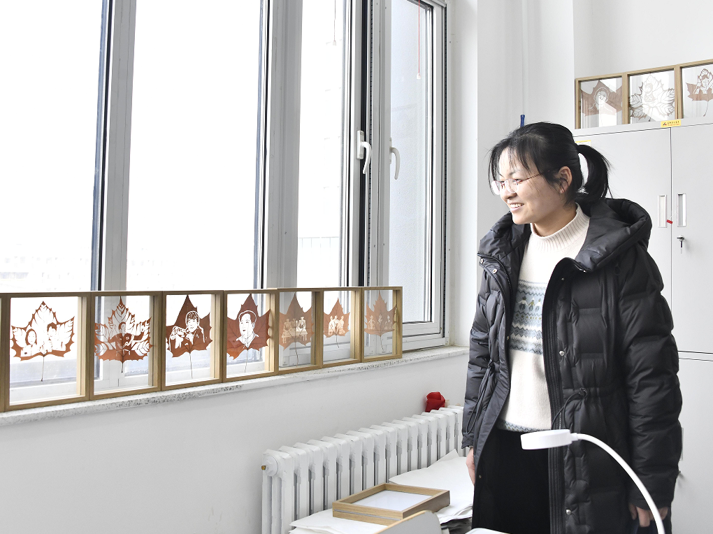 韩园园一行首先查看了北校区应急管理学院的市级非遗项目——叶雕工作室,详细询问了叶雕的材料来源及制作过程,应急管理学院院长郭玉娟向客人介绍了叶雕工作室的建立初衷、建设过程和下一步的规划。在南校区,韩园园一行还饶有兴趣地了解插花的做作过程,并查看了干花作品——团扇。