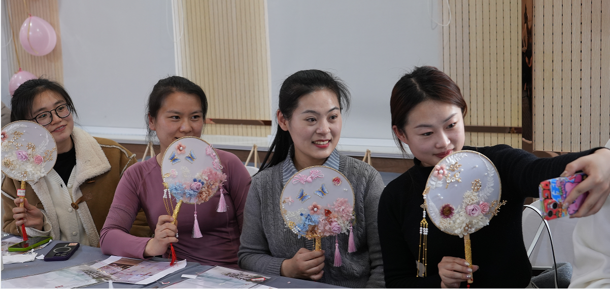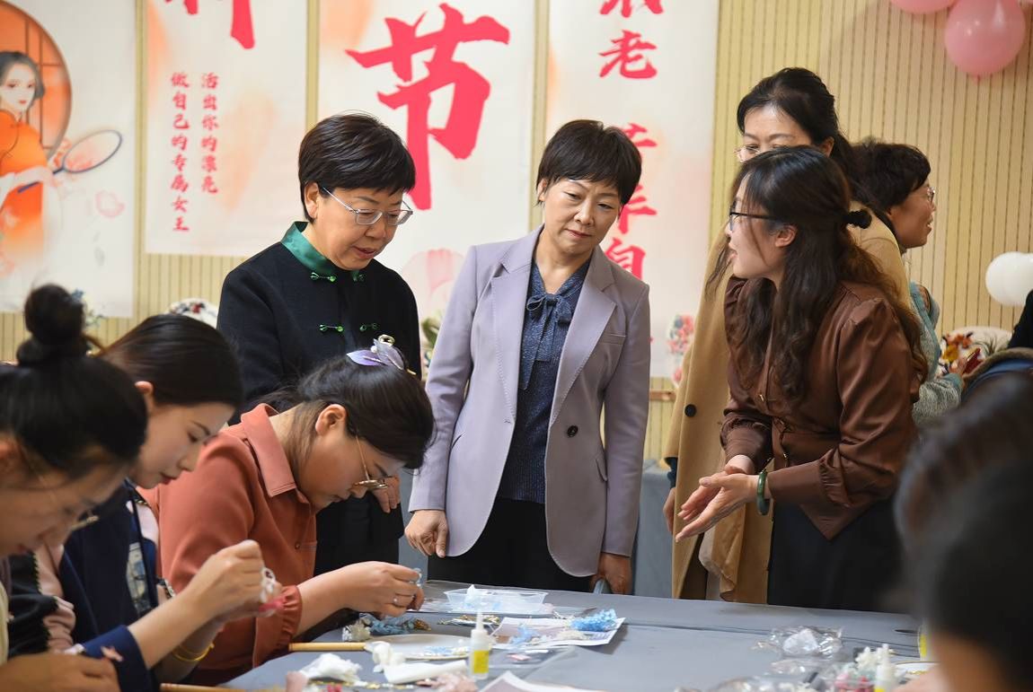 女教职工互相欣赏彼此作品,拍照留念,现场气氛温馨,大家脸上洋溢着喜悦。广大女职工在感受美、欣赏美、创造美的过程中度过了一个愉快的节日。
