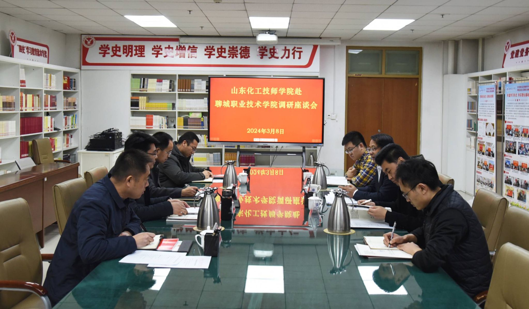 3月8日,山东化工技师学院党政办公室朱景洋、宣传部部长徐廷国一行4人来我校调研鲁西“四史”主题教育馆建设及运行情况。学校党委委员、统战部部长崔爱民陪同活动。