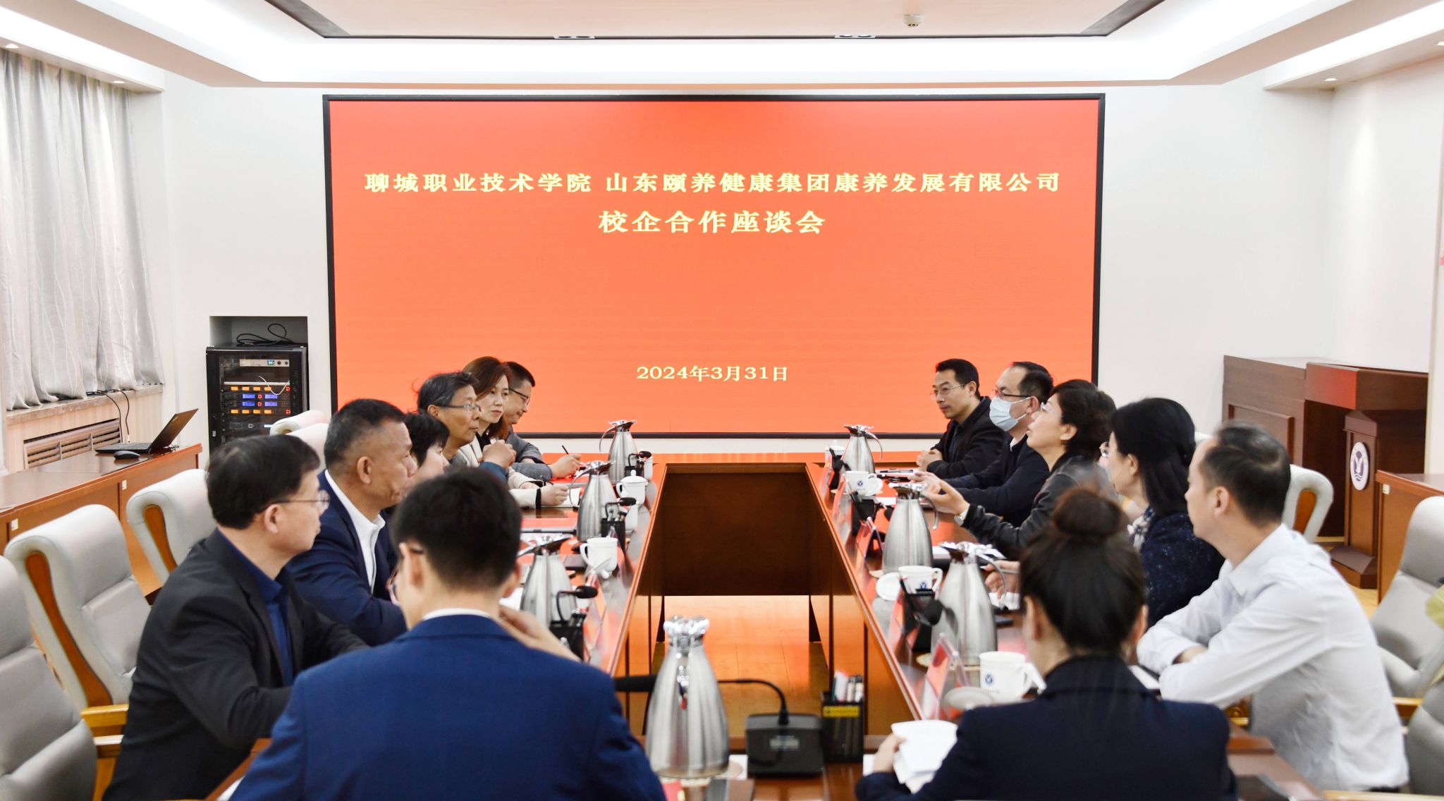 3月31日,山东颐养健康集团康养发展有限公司董事长殷秀真,中北大学运动医学研究所所长刘鸿宇一行来聊城职业技术学院洽谈合作。学校党委书记靳凤莲,党委委员、副院长刘雪巍,党委委员、组织部部长孙华祥出席座谈会。