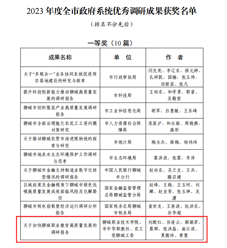 近日,聊城市人民政府办公室公布了“关于2023年度全市政府系统优秀调研成果和调查研究工作先进单位的通报”,聊城职业技术学院教师刘殿红主持撰写的《关于加快聊城职业教育高质量发展的调研报告》荣获“2023年度全市政府系统优秀调研成果”一等奖。