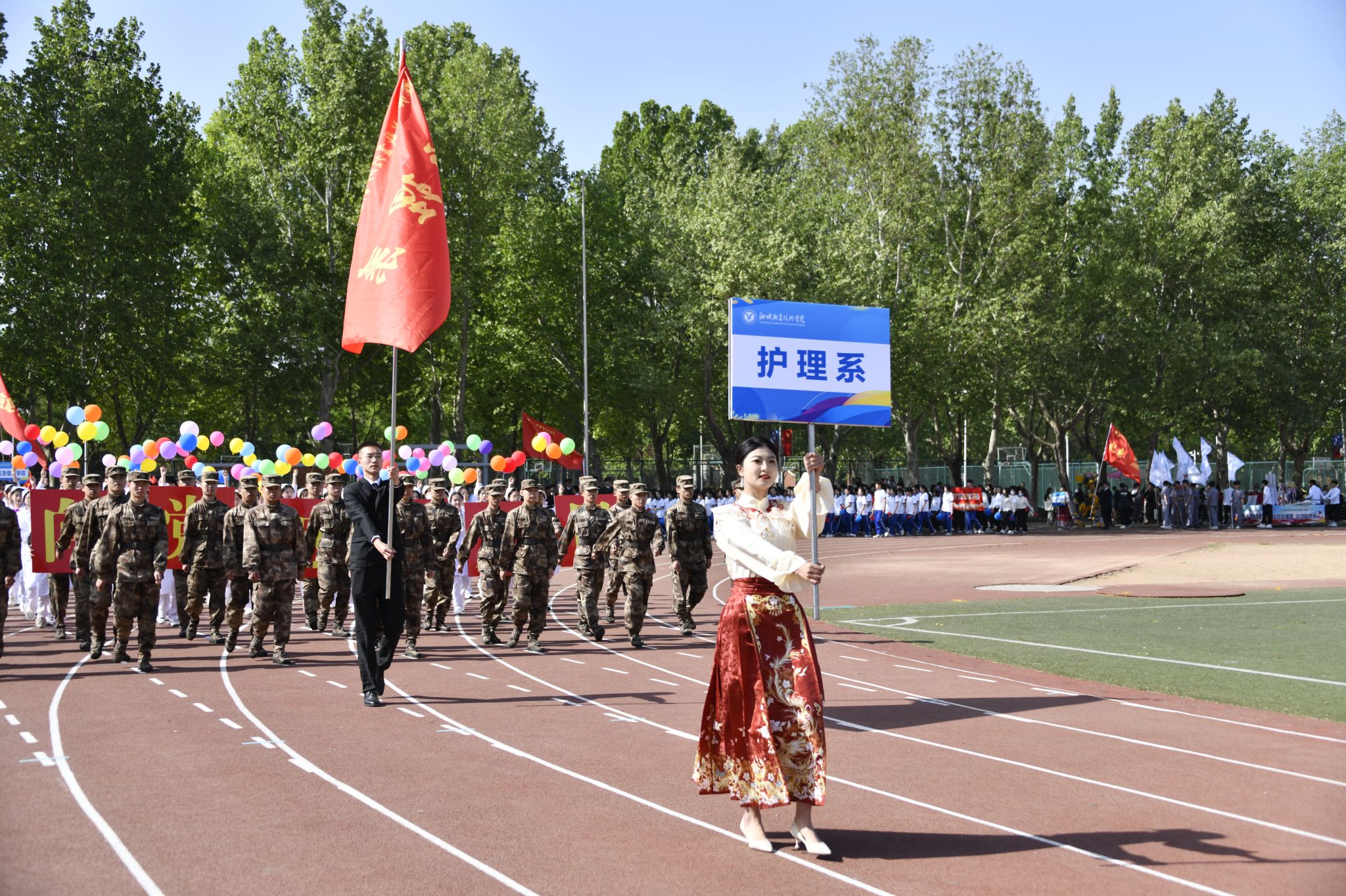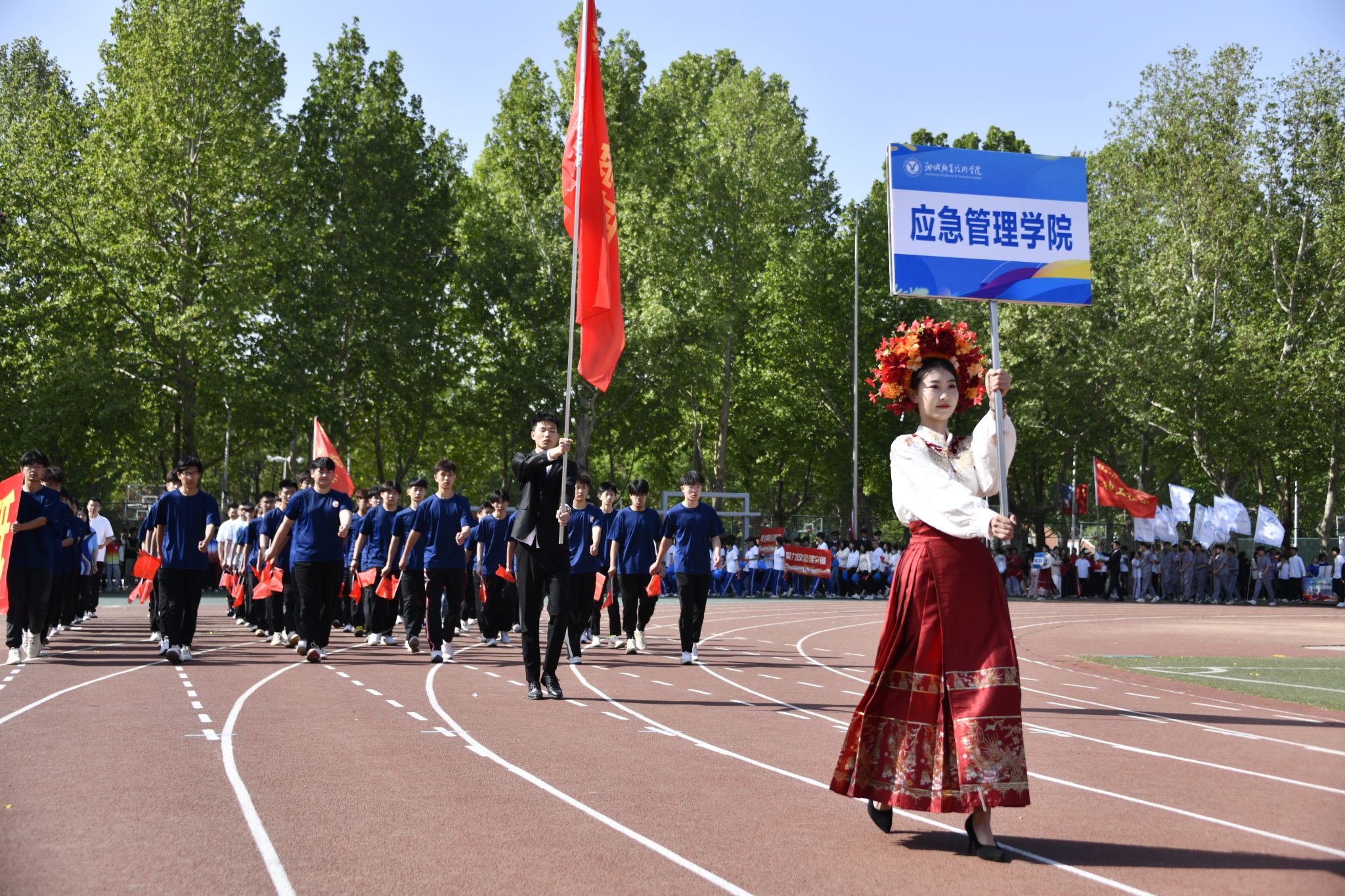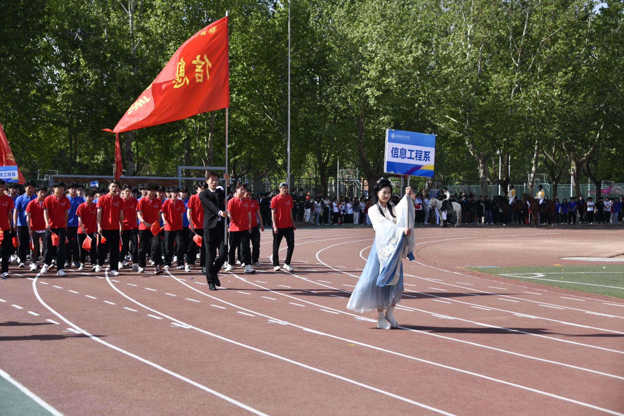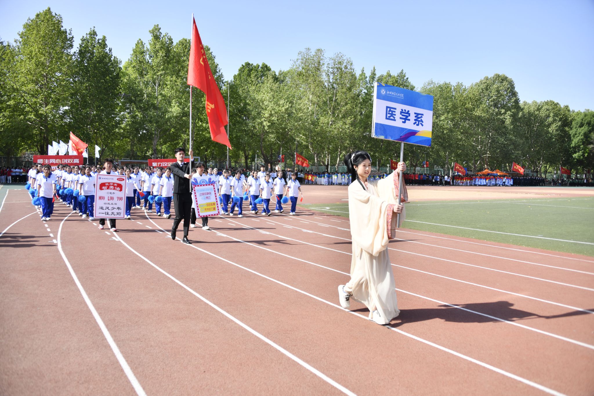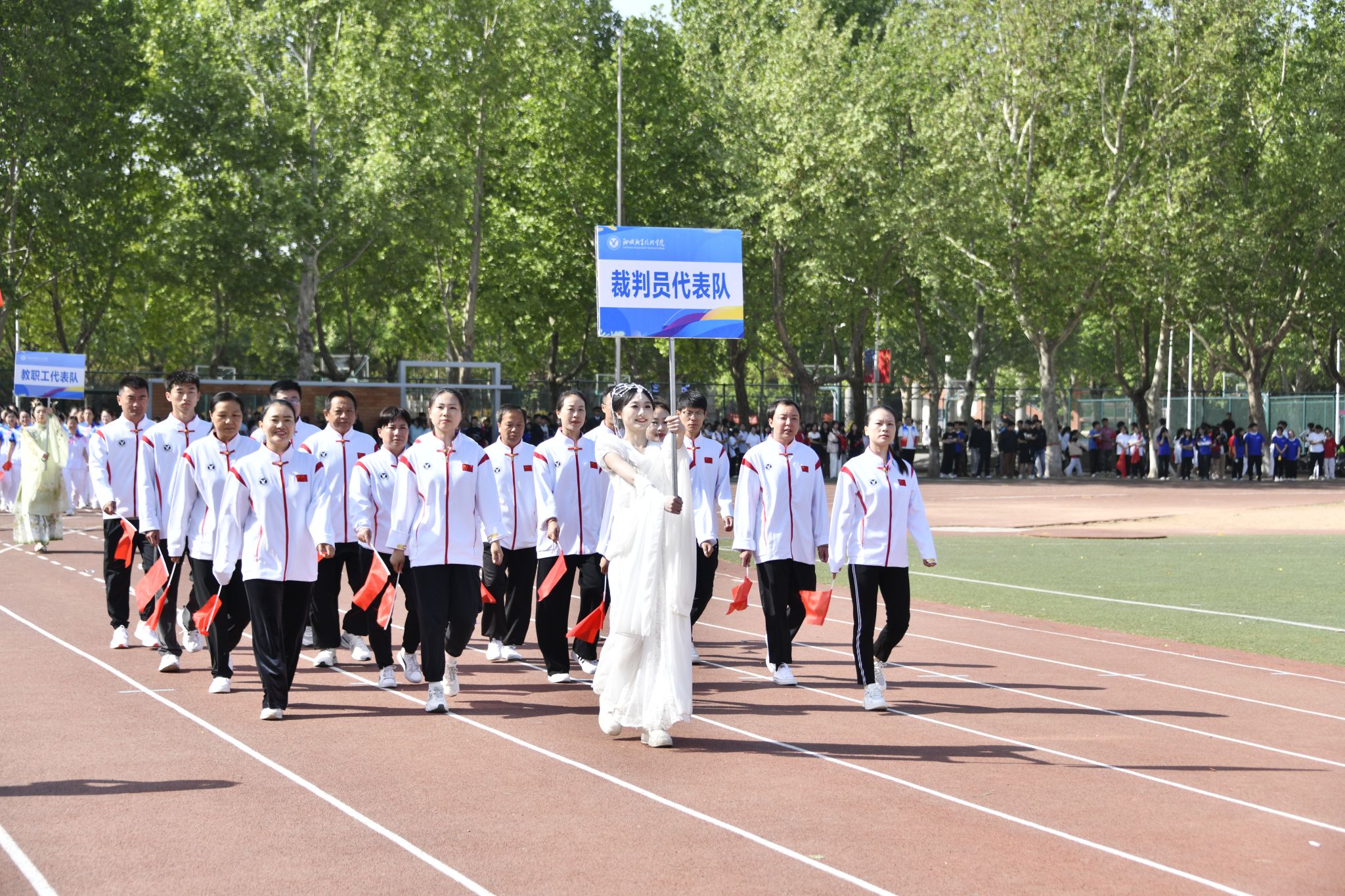 伴随着催人奋进的运动员进行曲,党旗、国旗在护卫队的护卫下入场,裁判员代表、教职工代表、各院系代表队也依次入场。运动员们精神抖擞、朝气昂扬走过主席台,他们整齐划一的步伐和飒爽英姿,赢得了阵阵掌声与欢呼声。