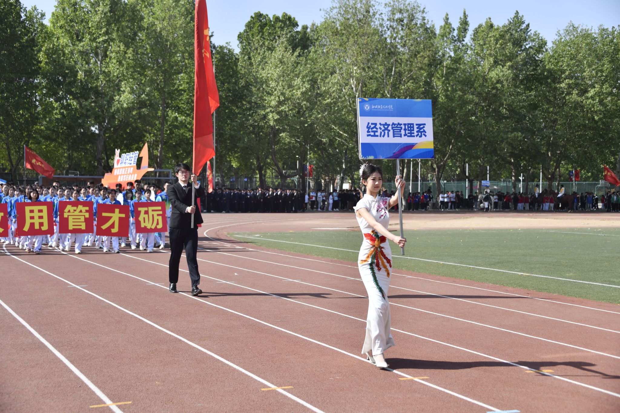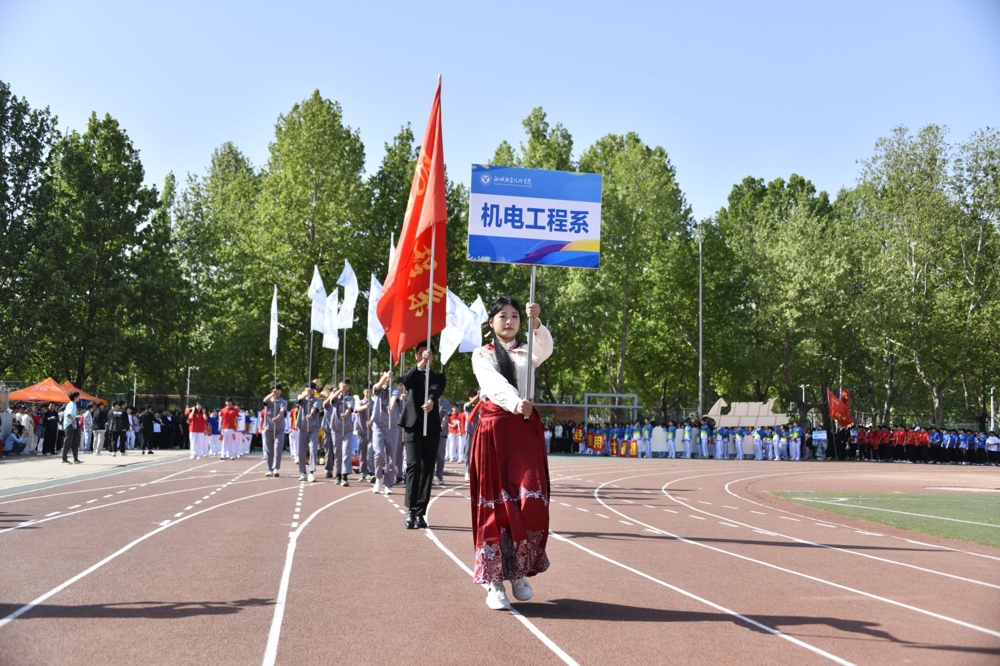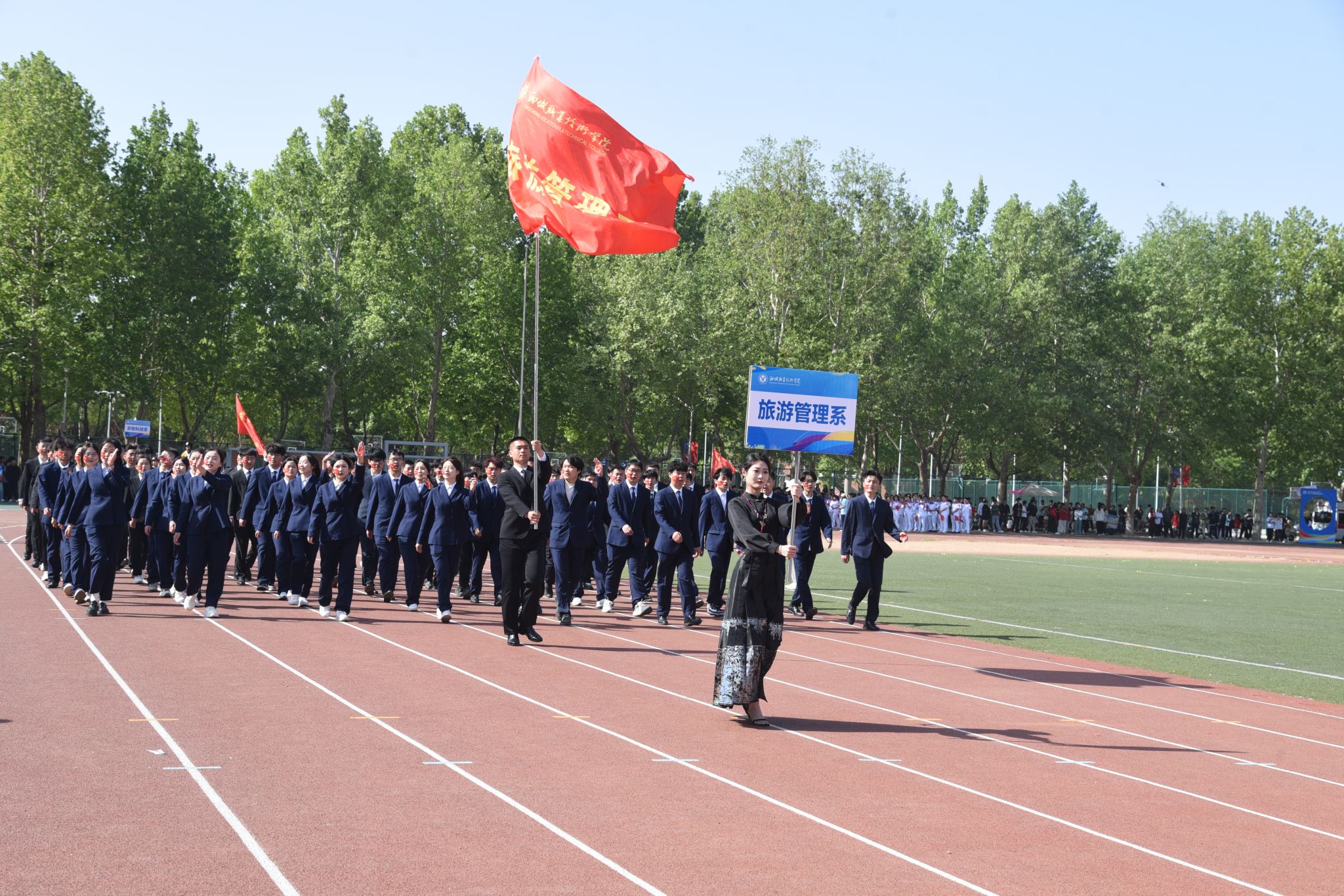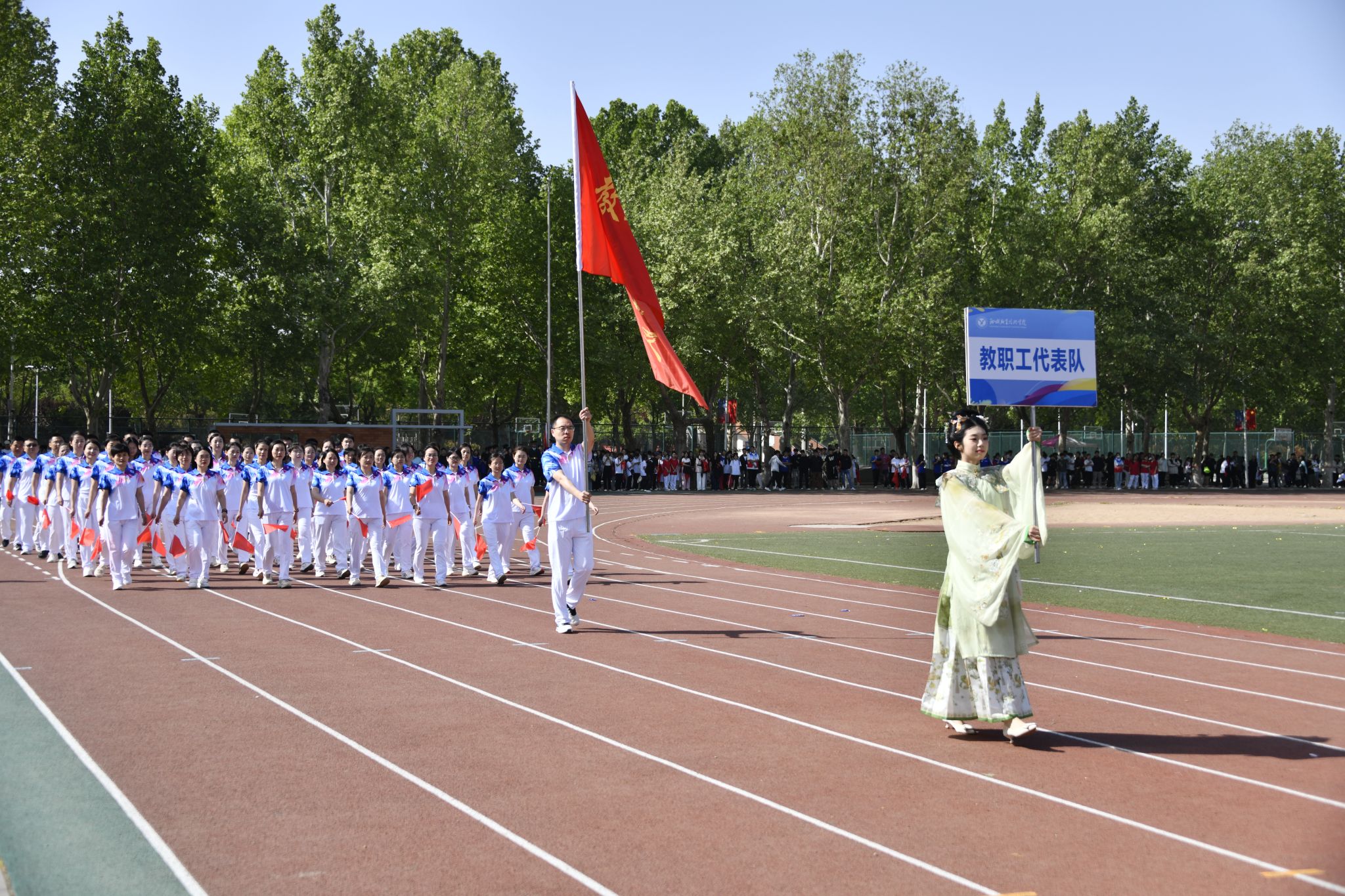 伴随着催人奋进的运动员进行曲,党旗、国旗在护卫队的护卫下入场,裁判员代表、教职工代表、各院系代表队也依次入场。运动员们精神抖擞、朝气昂扬走过主席台,他们整齐划一的步伐和飒爽英姿,赢得了阵阵掌声与欢呼声。