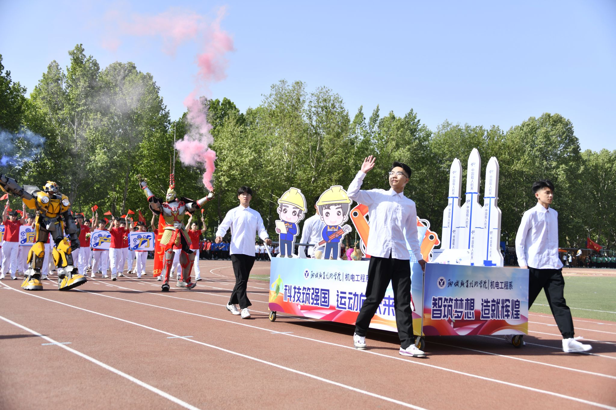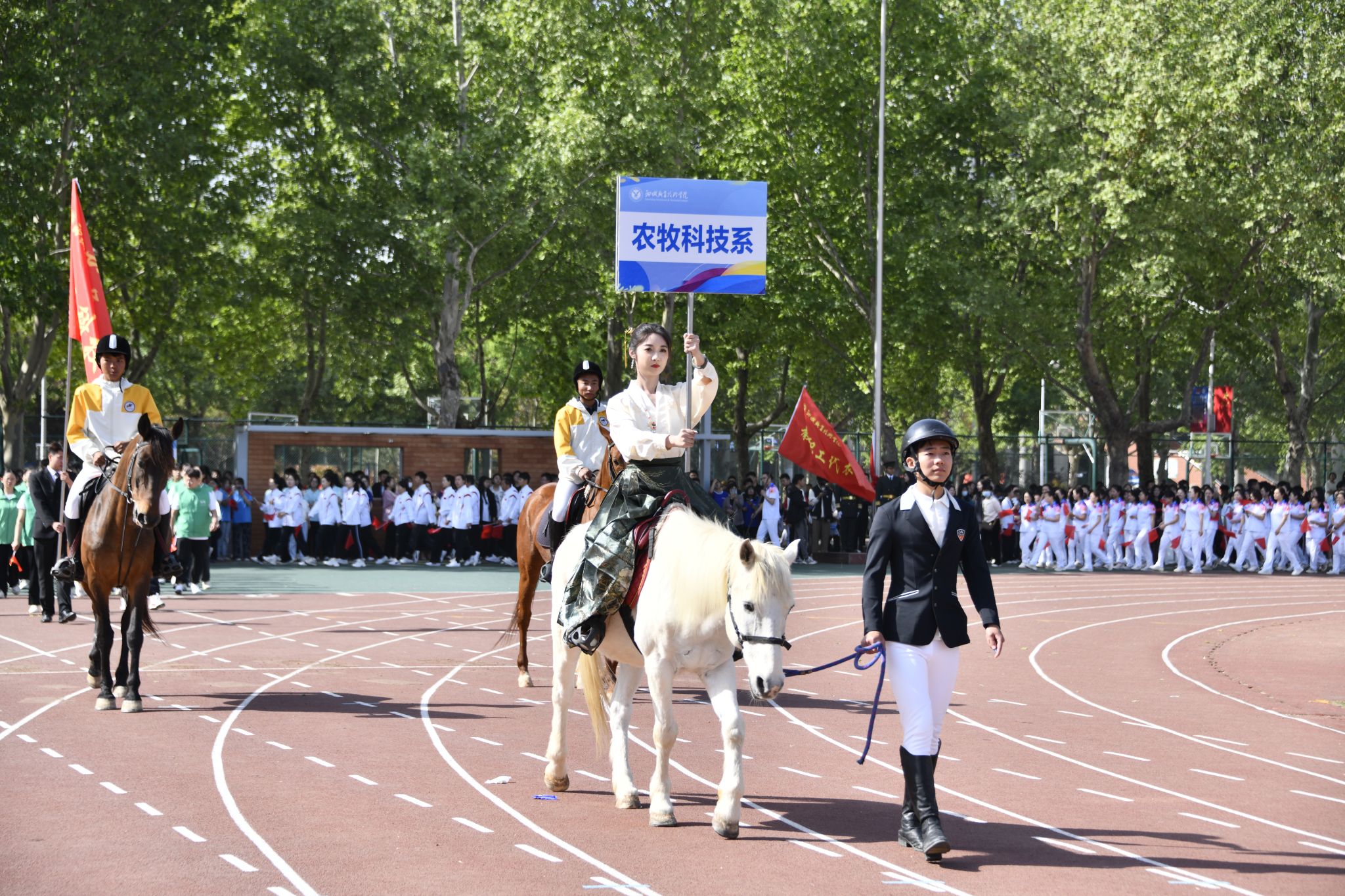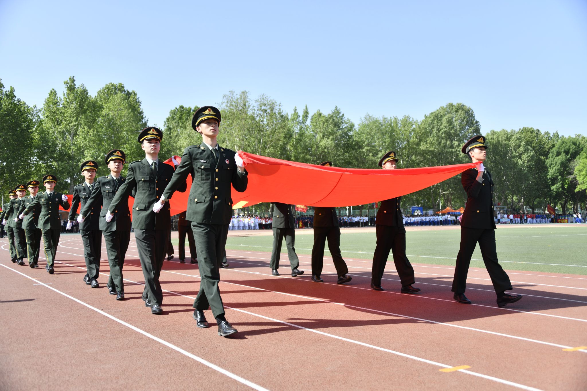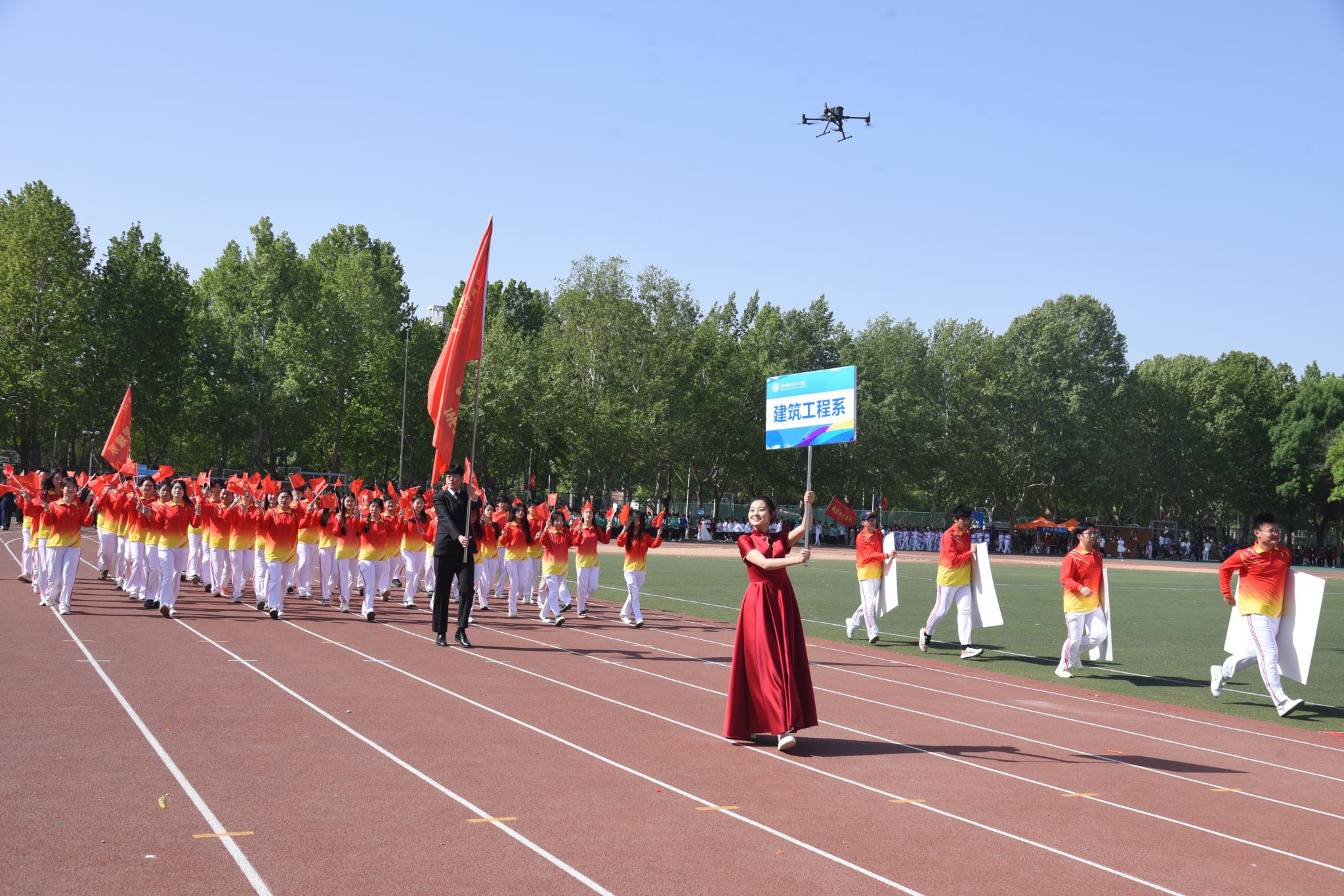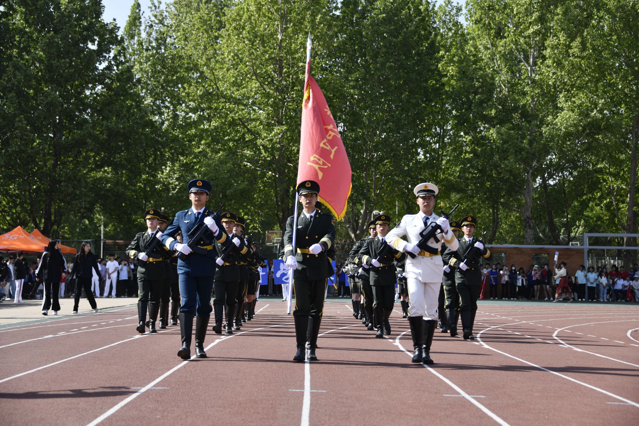 伴随着催人奋进的运动员进行曲,党旗、国旗在护卫队的护卫下入场,裁判员代表、教职工代表、各院系代表队也依次入场。运动员们精神抖擞、朝气昂扬走过主席台,他们整齐划一的步伐和飒爽英姿,赢得了阵阵掌声与欢呼声。