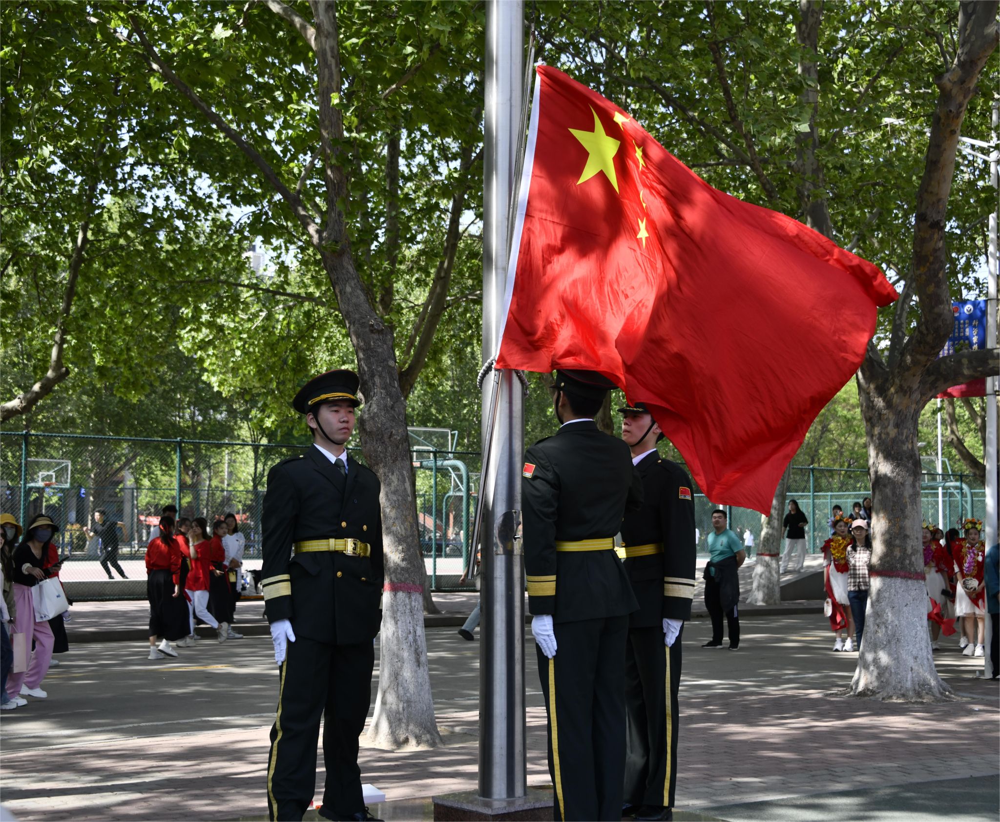 入场完毕,伴随着庄严的《中华人民共和国国歌》,全体师生起立,奏唱国歌,鲜艳的五星红旗在大家的注目礼中冉冉升起。