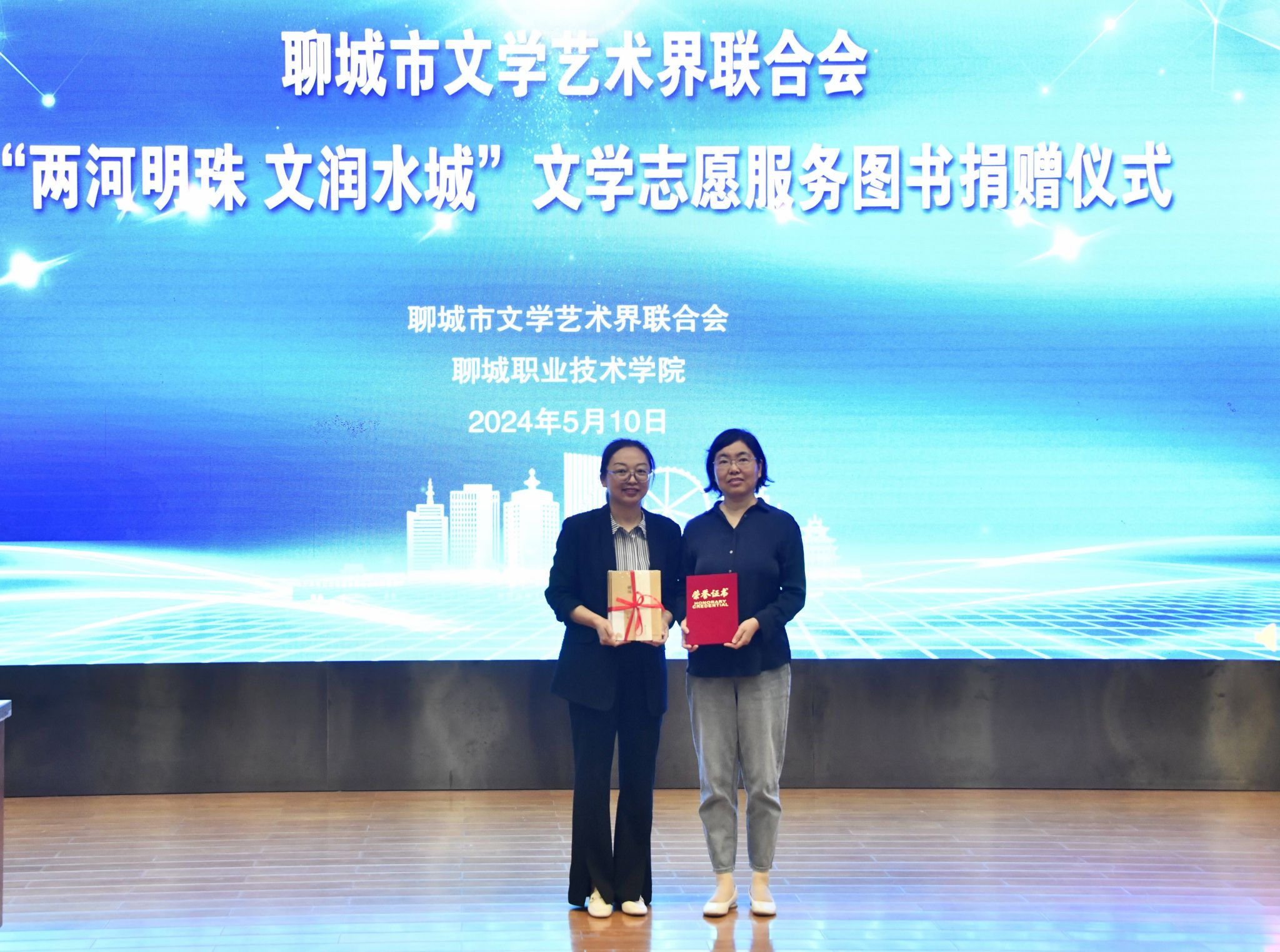 市文联向聊城职院捐赠《聊城文艺》《初夏》等文学书籍与期刊,臧利敏主席与刘婷婷馆长共同完成“悦”读接力、“书”送青春的爱心传递。