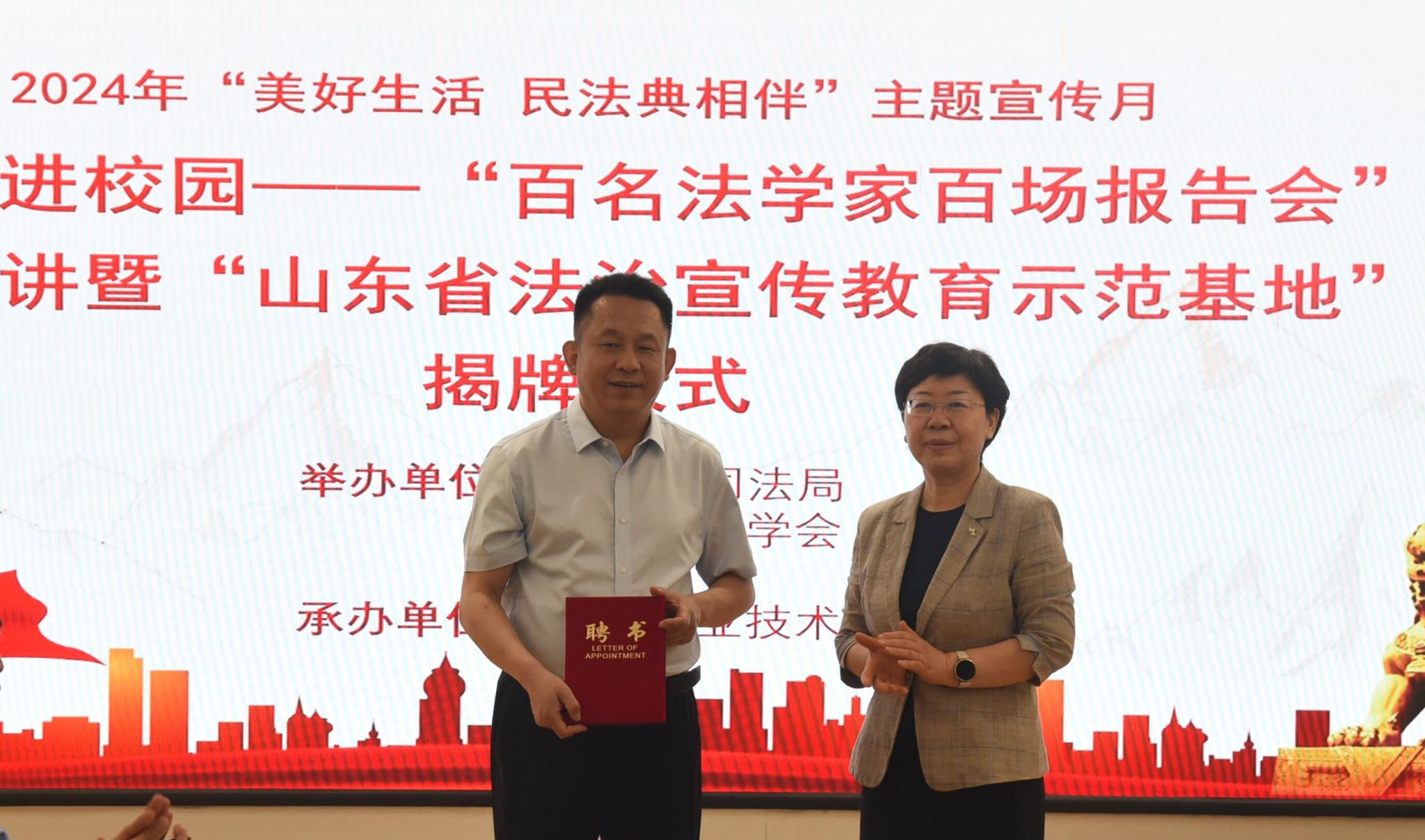 靳凤莲、杨国强共同为“山东省法治宣传教育示范基地”——聊城职业技术学院揭牌。靳凤莲为杨国强颁发法治副校长聘书。