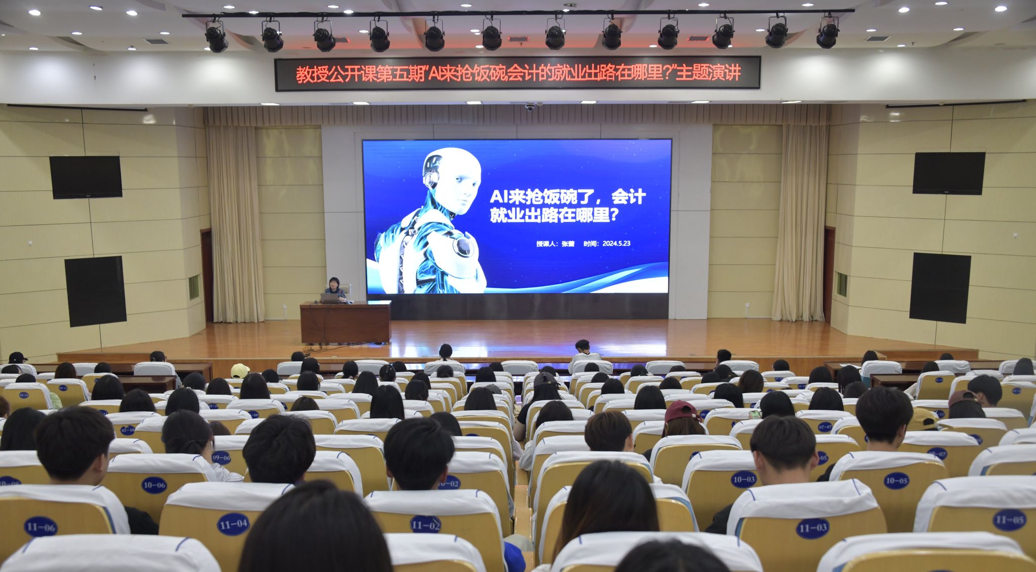 5月23日,聊城职业技术学院于南校区图书馆报告厅举办教授公开课第五期。张蕾教授作“AI来抢饭,会计的就业出路就在哪里?”专题讲座。