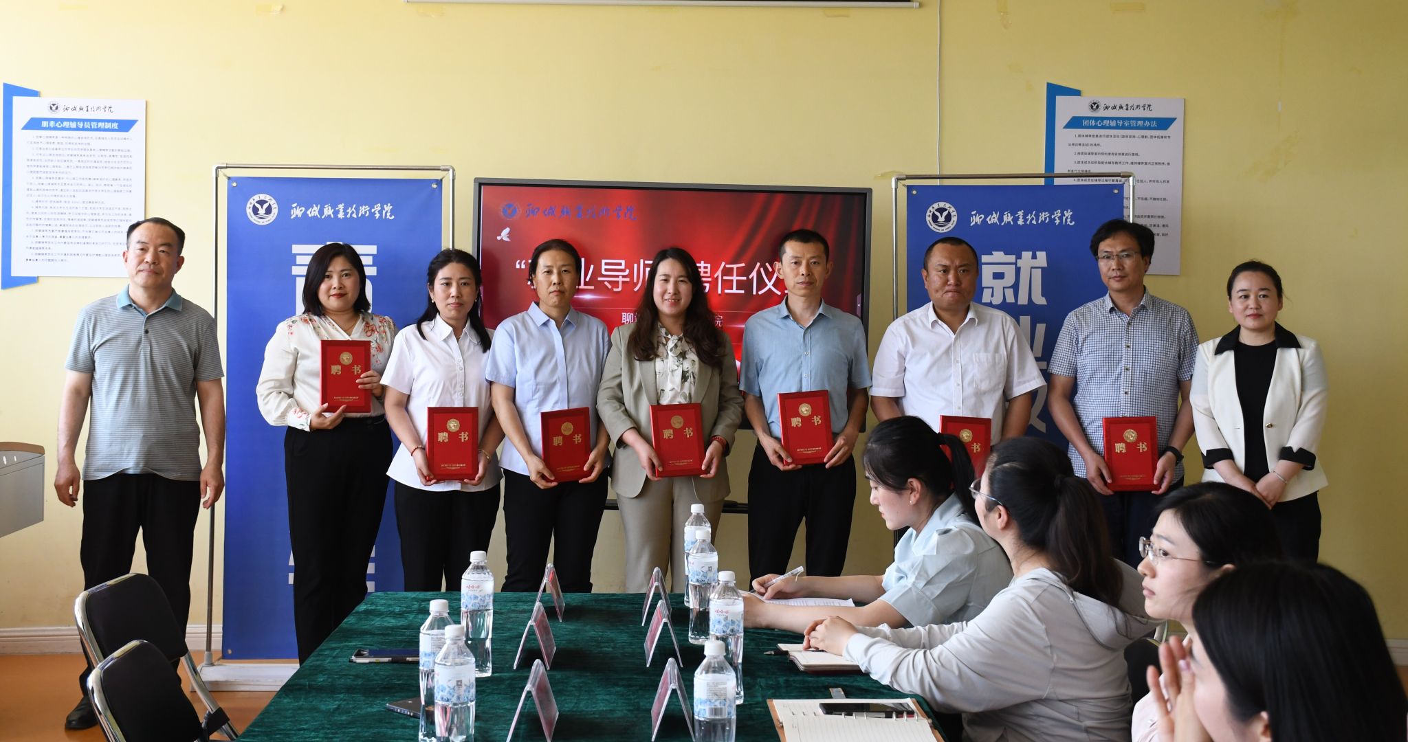 聊城市人力资源社会保障局毕业生服务科科长谢庆军,聊城职业技术学院学生工作部副部长李林为来自7家大中小企业的人力资源总监颁发了“就业指导师”聘书。这是我校首次聘用校外专家担任学校大学生就业导师,也是我校组建“校内结合、专兼互补”的大学生职业发展与就业指导师资队伍,促进毕业生更满意就业工作的尝试和探索。