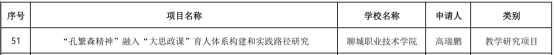 近日,教育部社科司公布了“2024年度高校思想政治理论课教师研究专项一般项目”的立项名单,聊城职业技术学院高瑞鹏教授主持的课题《“孔繁森精神”融入“大思政课”育人体系构建和实践路径研究》获批立项。全国共有200项课题立项该专项,其中,山东省9所本科院校与3所高职院校的12项课题入选。