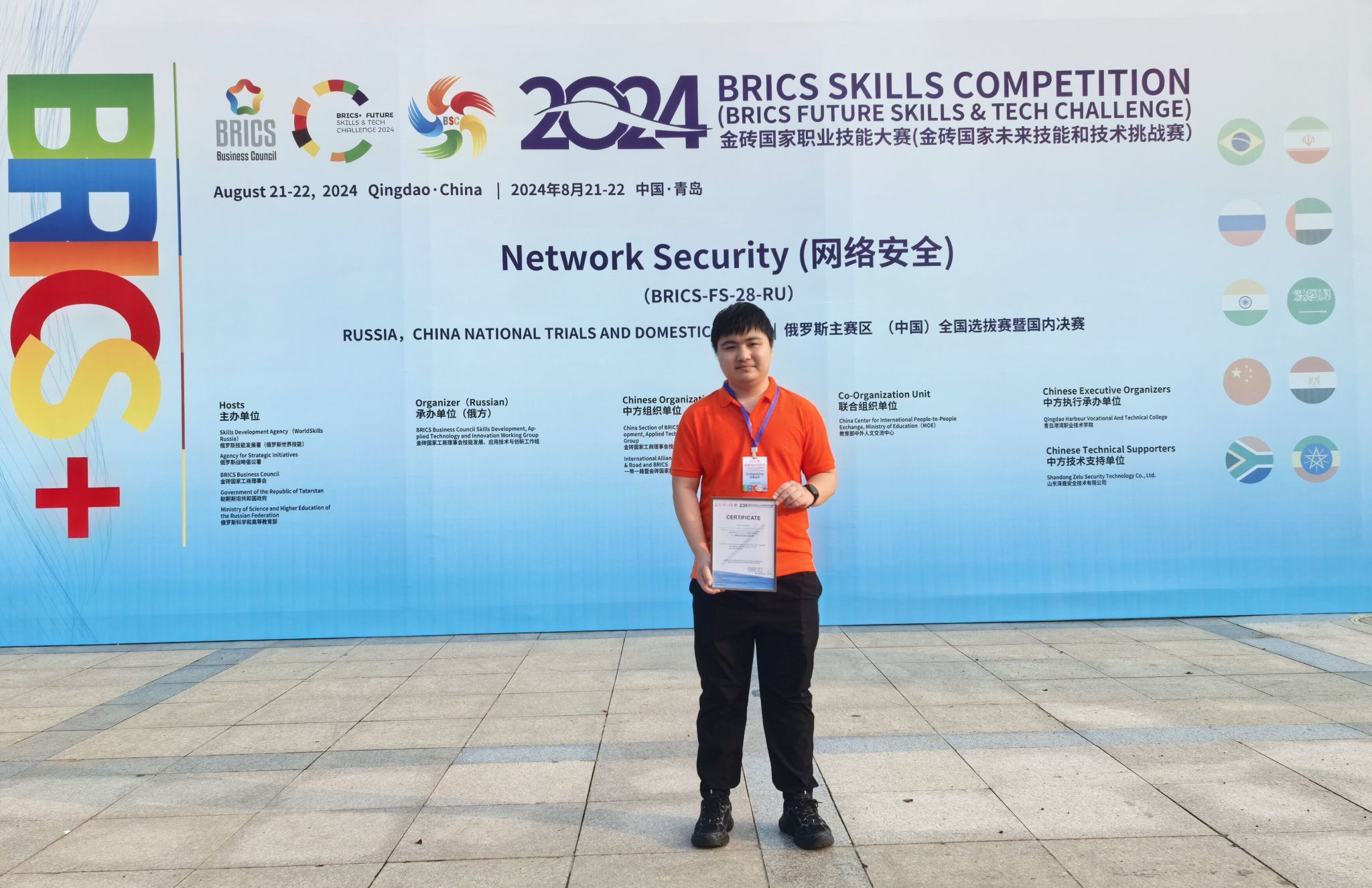 本次大赛由俄罗斯技能发展署、俄罗斯战略倡议署、金砖国家工商理事会、鞑靼斯坦共和国政府、俄罗斯科学和高等教育部共同主办,中方组织工作则由金砖国家工商理事会技能发展、应用技术与创新中方工作组,“一带一路”暨金砖国家技能发展国际联盟以及教育部中外人文交流中心负责。“网络安全”赛项共有来自17省市的47支代表队同台竞技,我校王烨同学在山东省选拔赛中脱颖而出,代表山东队参本次全国选拔赛暨国内决赛,并最终斩获一等奖。