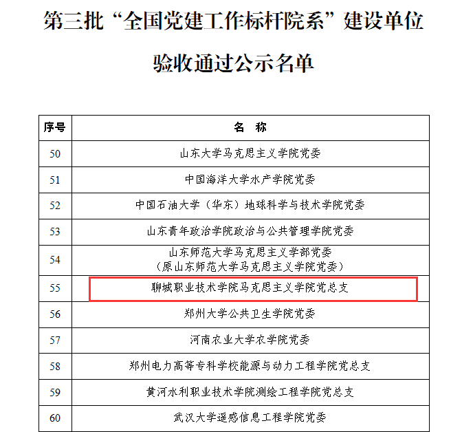 近日,教育部思想政治工作司公示了第三批新时代高校党建示范创建和质量创优工作建设单位验收结果,聊城职业技术学院马克思主义学院党总支通过第三批“全国党建工作标杆院系”验收。