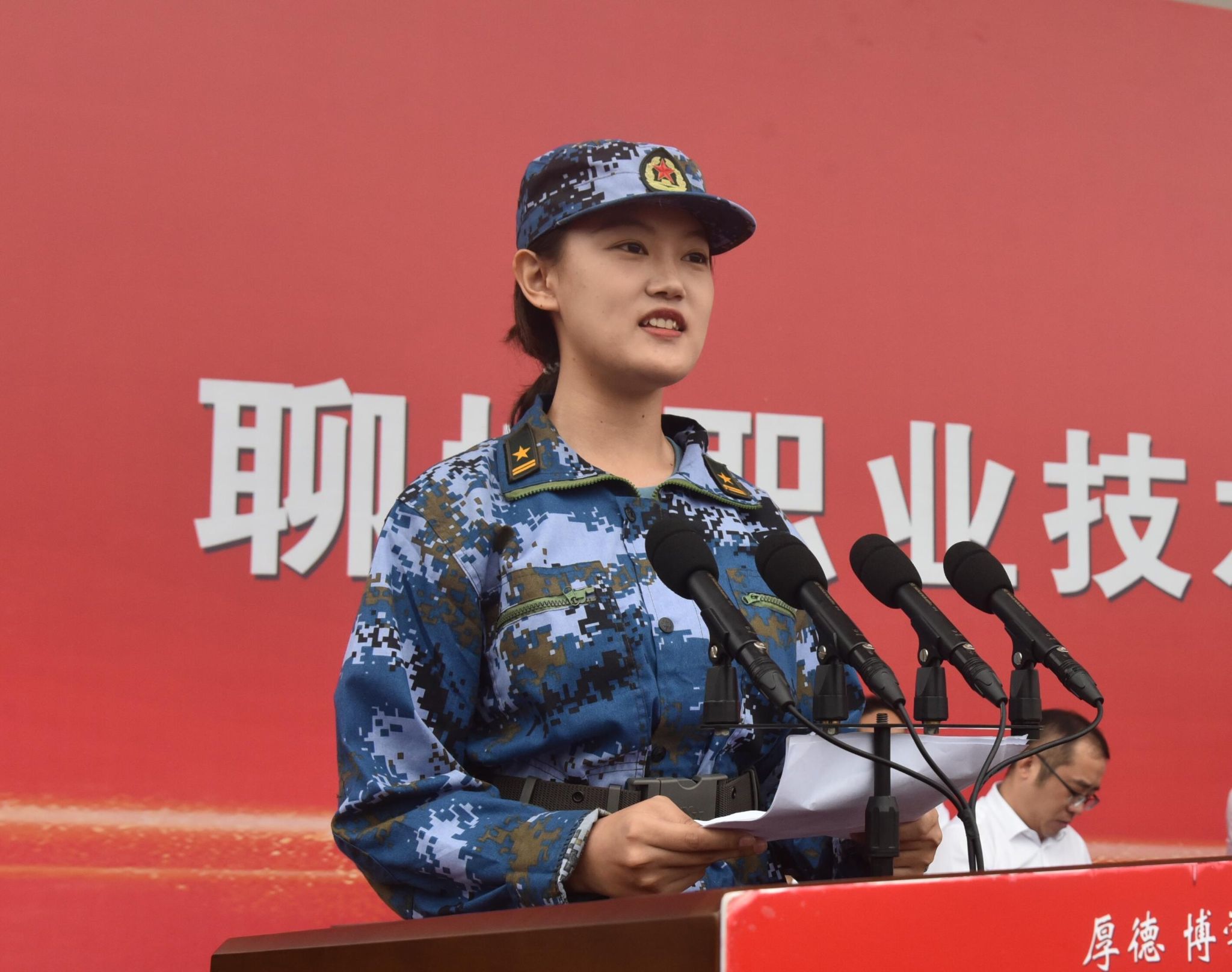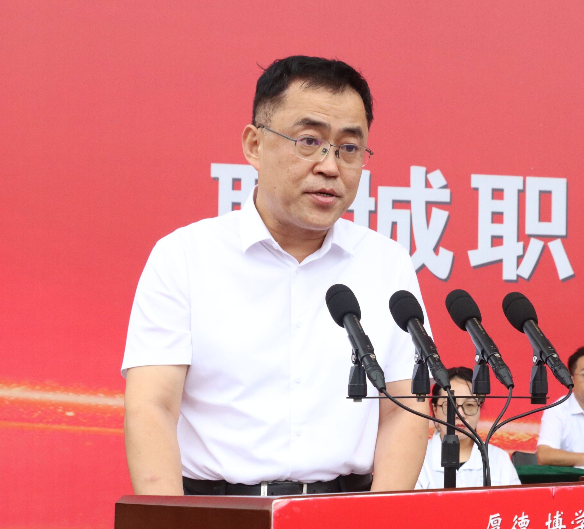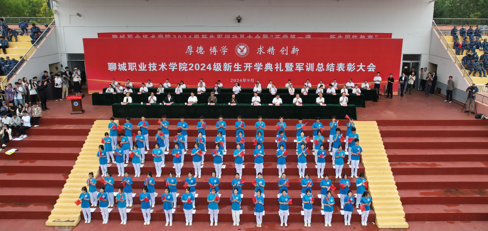 9月14日,聊城职业技术学院举行2024级新生开学典礼暨军训总结表彰大会。武警聊城支队副政治委员申建国出席大会。学校党委书记靳凤莲,党委副书记、院长徐龙海,全体党委领导班子成员出席大会。大会由党委委员、副院长刘雪巍主持。