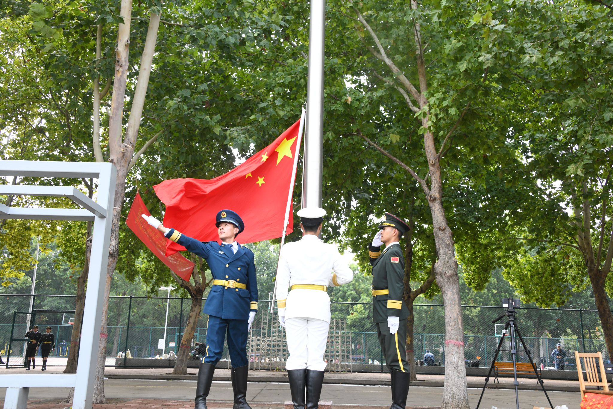上午8时,在庄严的国歌声中,鲜艳的五星红旗冉冉升起,全体师生庄严肃立,齐唱国歌。