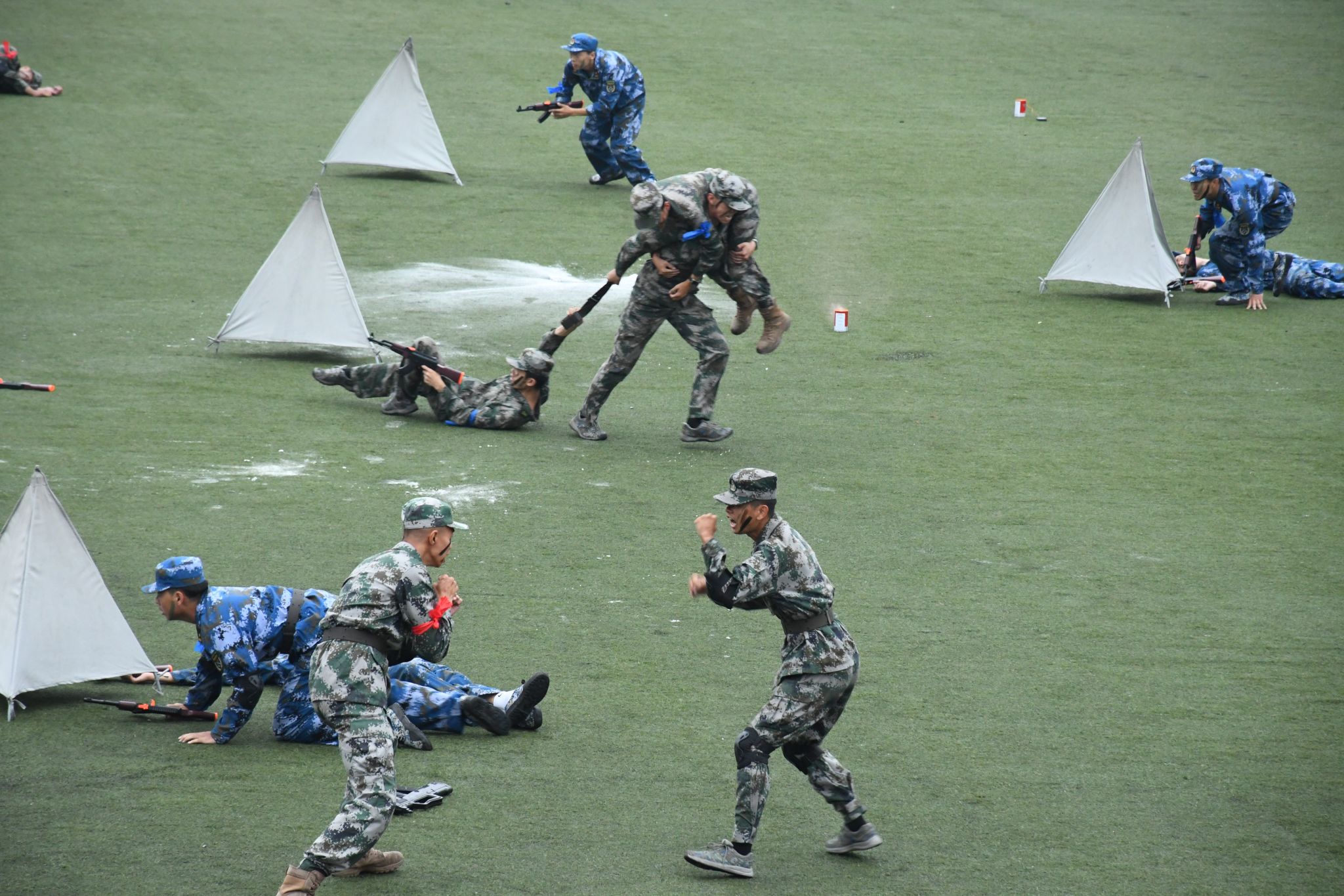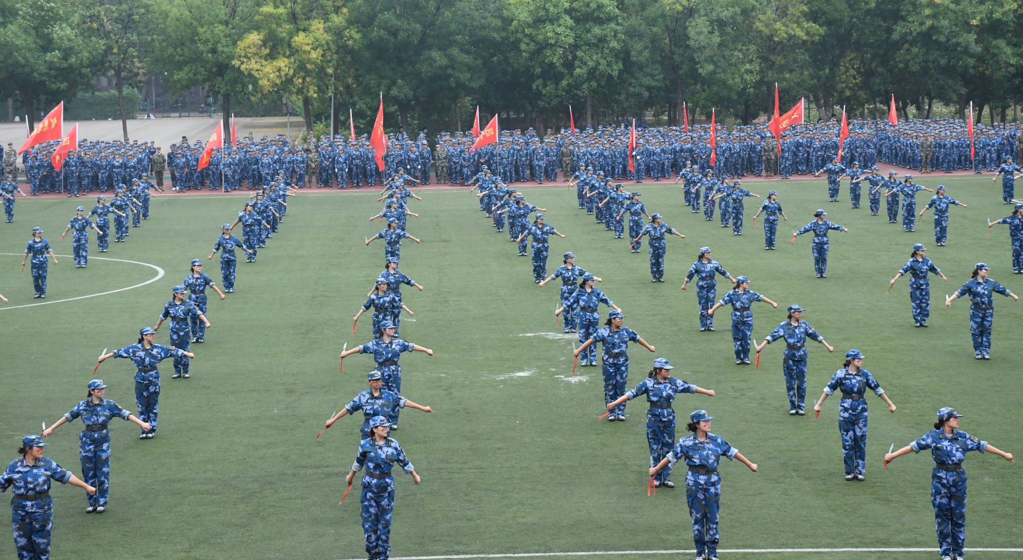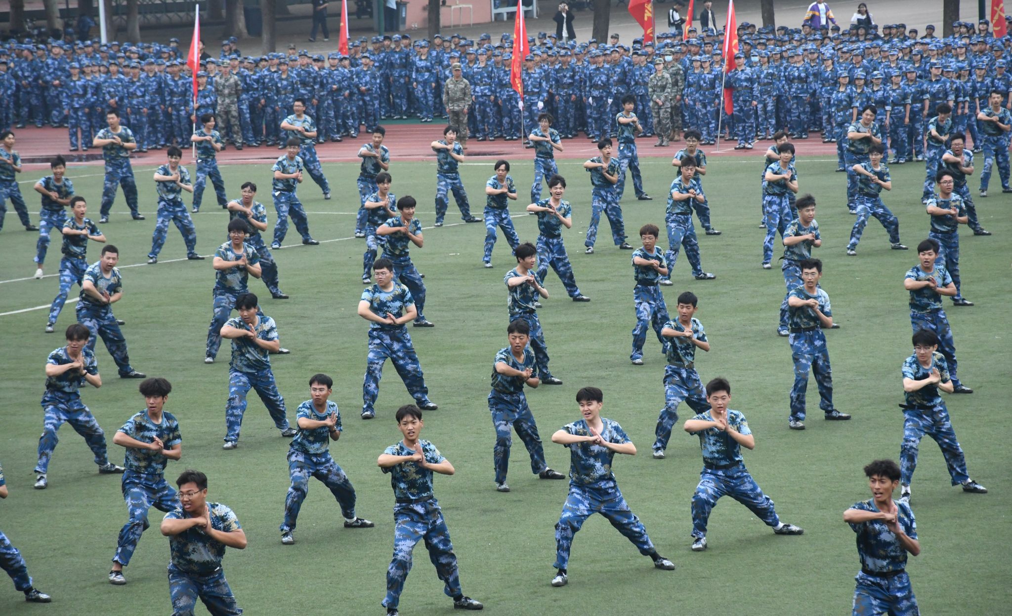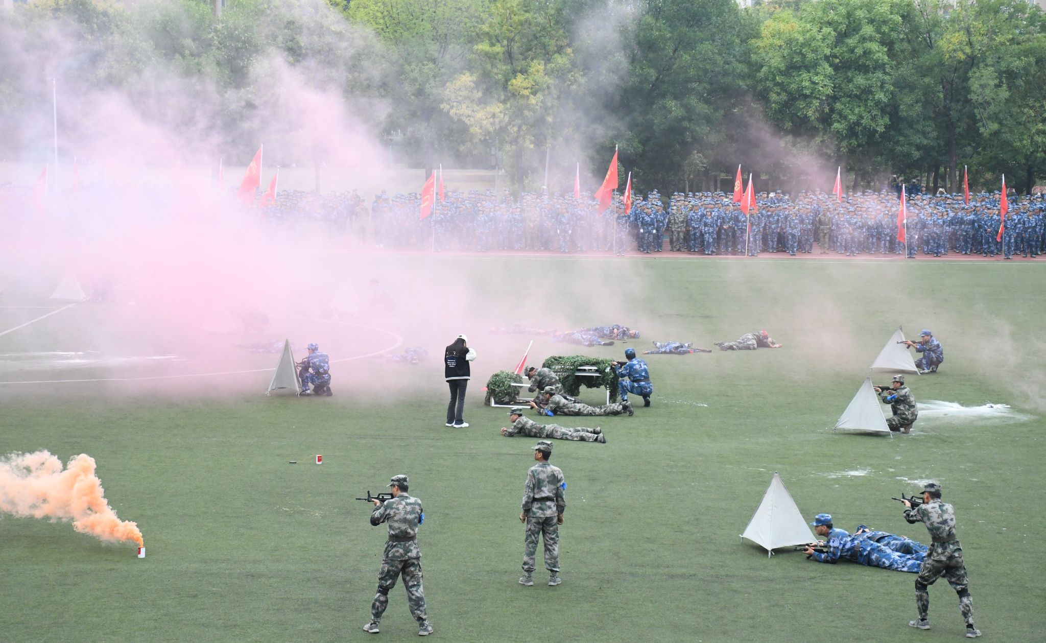 军训成果展示中,刺杀操、擒敌拳、匕首操、战术展示红蓝对决等展演精彩纷呈,博得现场阵阵掌声。