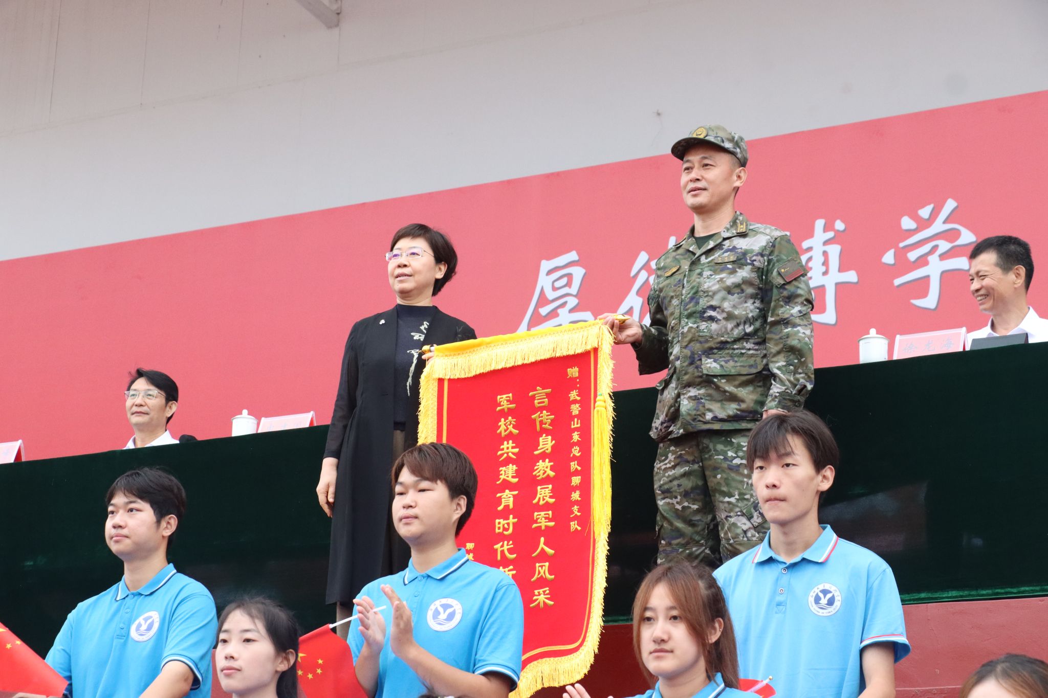 靳凤莲向承训部队赠送锦旗,对他们在军训期间所表现出的负责、坚韧和不屈不挠的精神给予高度评价。