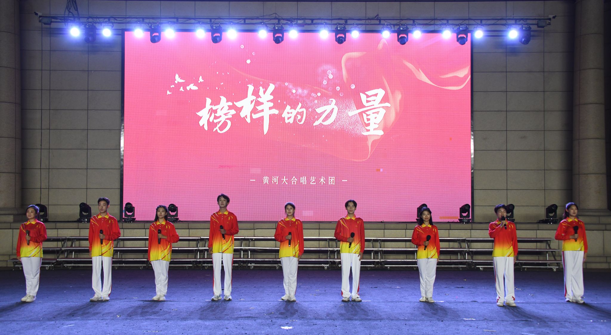 黄河大合唱艺术团带来的歌曲《我爱你中国》,用歌声赞美祖国,以旋律抒发情怀。舞蹈《唱支山歌给党听》,体现青年学生对党的深厚感情和坚定信仰。