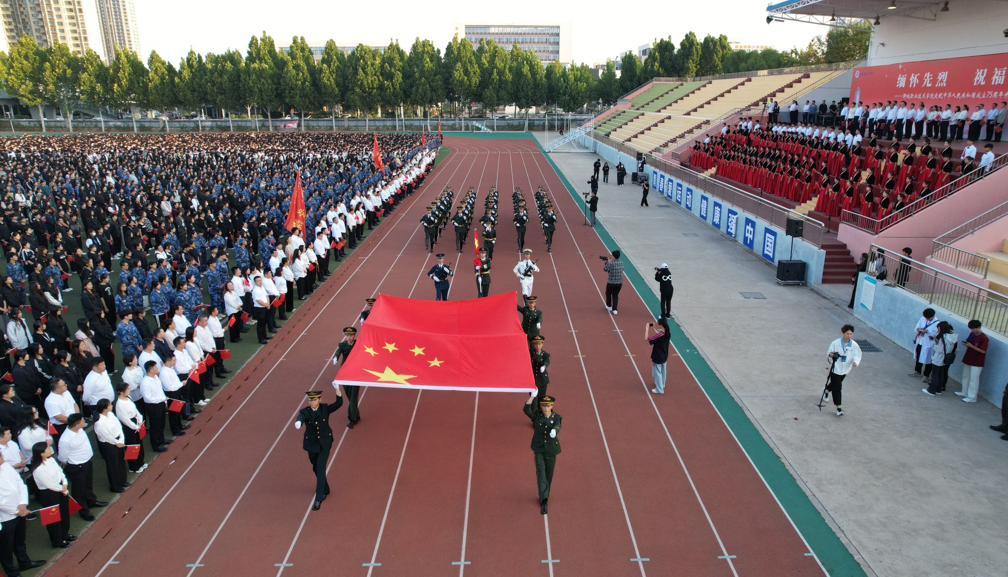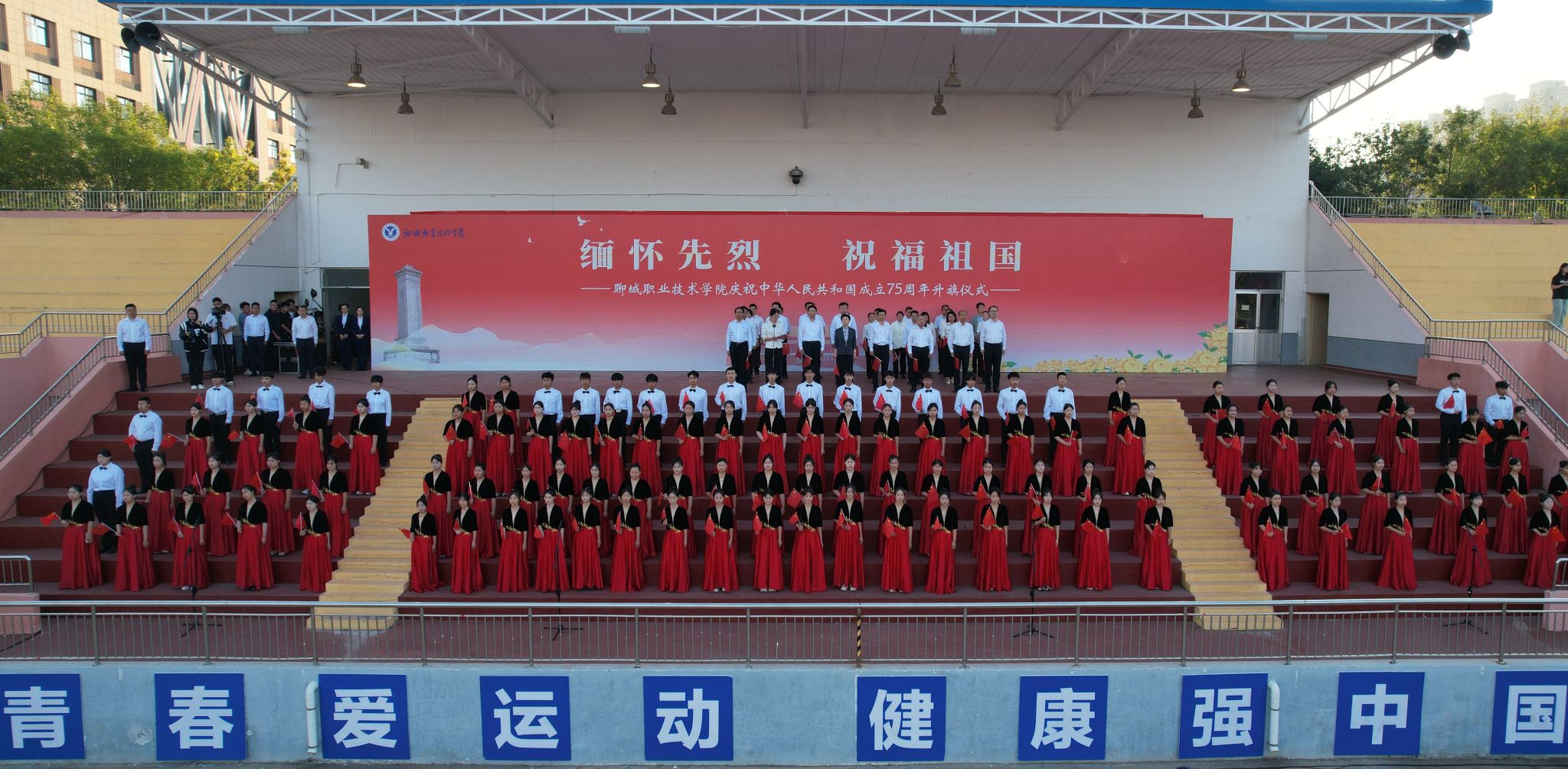 缅怀先烈,祝福祖国。9月29日,聊城职业技术学院举办庆祝中华人民共和国成立75周年升国旗仪式,全校师生向烈士致敬、为祖国祝福。