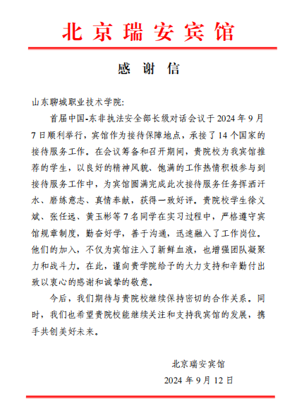近日,北京瑞安宾馆向我校发来感谢信,对学校在首届中国-东非执法安全部长级对话会议给予的大力支持和辛勤付出致以衷心的感谢和诚挚的敬意,对参与接待服务工作的7名实习学生给予赞扬。