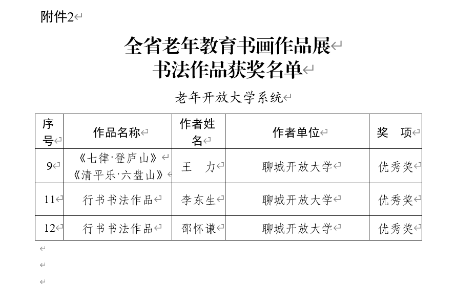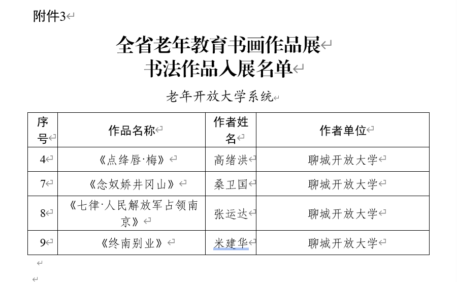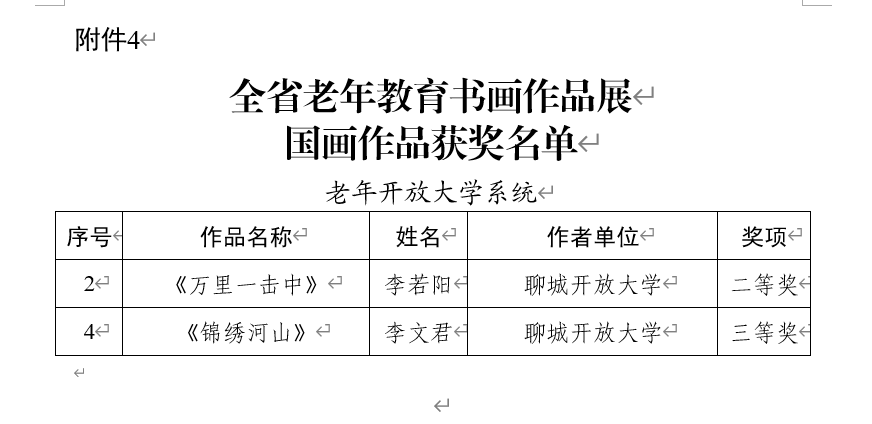 近日,山东老年开放大学、山东老年大学公布了2024年老年教育书画作品展评选结果。经评审委员会专家多轮评审,聊城职业技术学院报送的《万里一击中》等2幅国画作品分别获山东省二等奖、三等奖;《七律・登庐山》《清平乐・六盘山》等4幅书法作品获优秀奖,《点绛唇·梅》等4辐书法作品在山东省入展,我校被授予全省老年教育书画作品展的优秀组织单位称号。