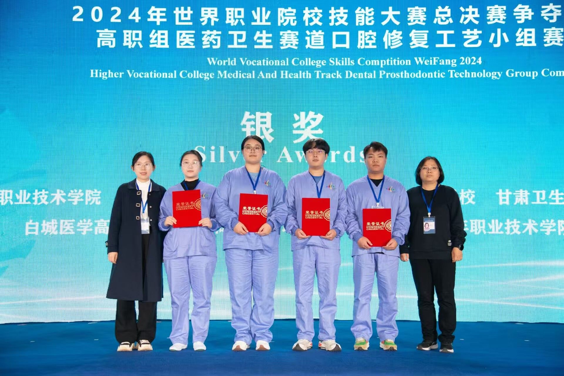 口腔修复工艺小组(赛项)共有来自全国各地47支队伍的171名选手参赛,我校参赛选手张亚男、李继乾、毛艺潼、周建与指导老师冯桂芝、周静组成的代表队获得银奖。